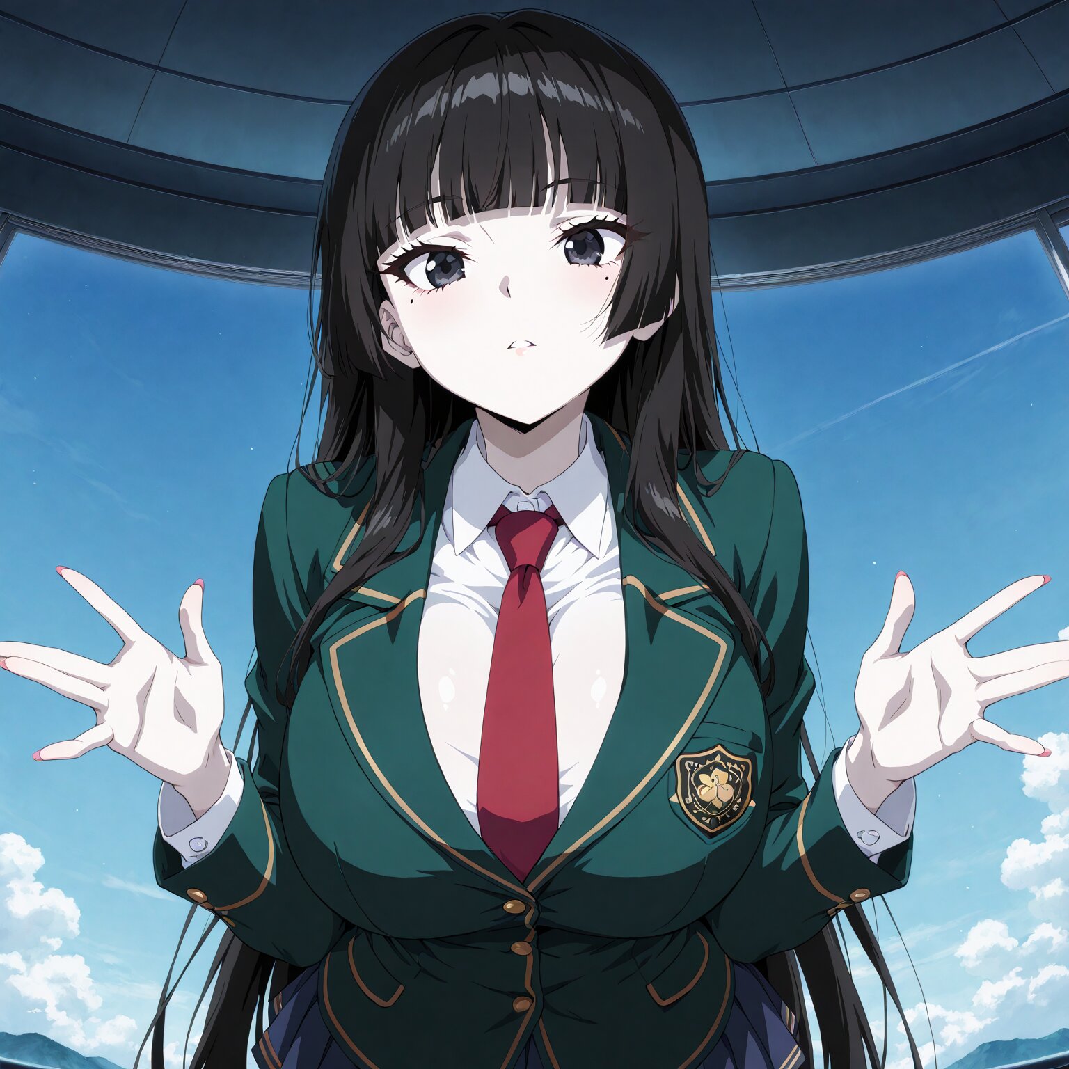 (1girl) Long hair, black hair, dark eyes, hime cut, blunt bangs, huge breasts, very large breasts, pale skin long eyelashes, mole under right eye eyes without highlights School uniform, green blazer, dress shirt, tie Pleated skirts, mini skirts, BREAK, ((newest, anime, animation, anime screen capture, anime style:1.3)) BREAK, ((masterpiece, , vibrant, very aesthetic, highly detailed, best quality, 16k:1.3)) perfect fingers,