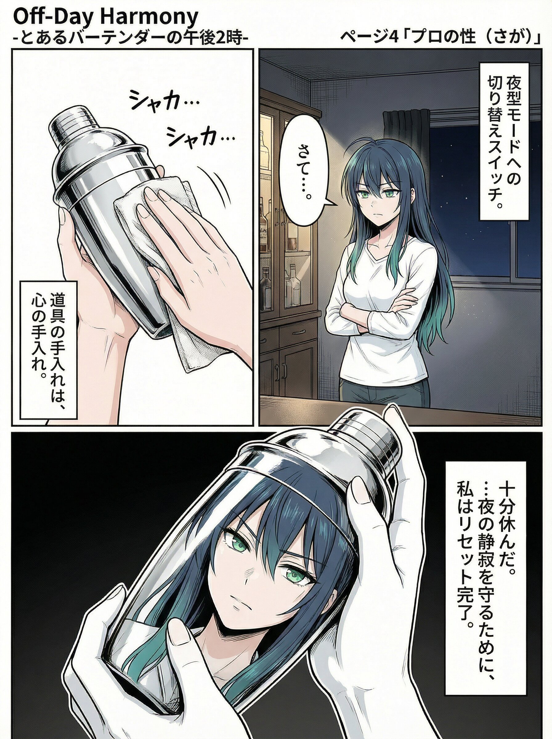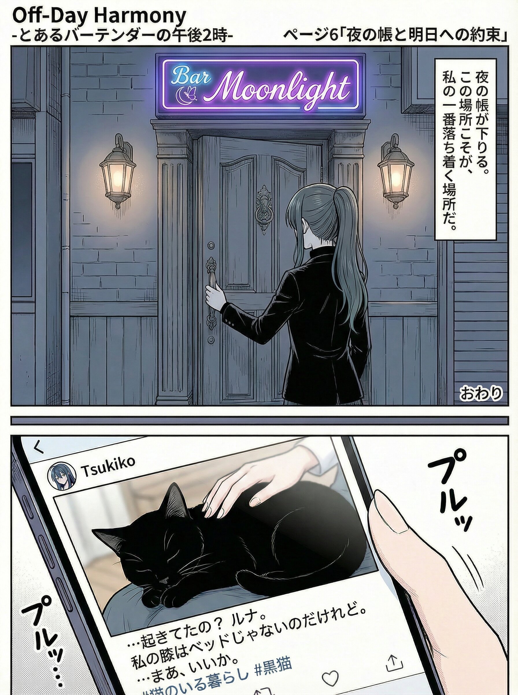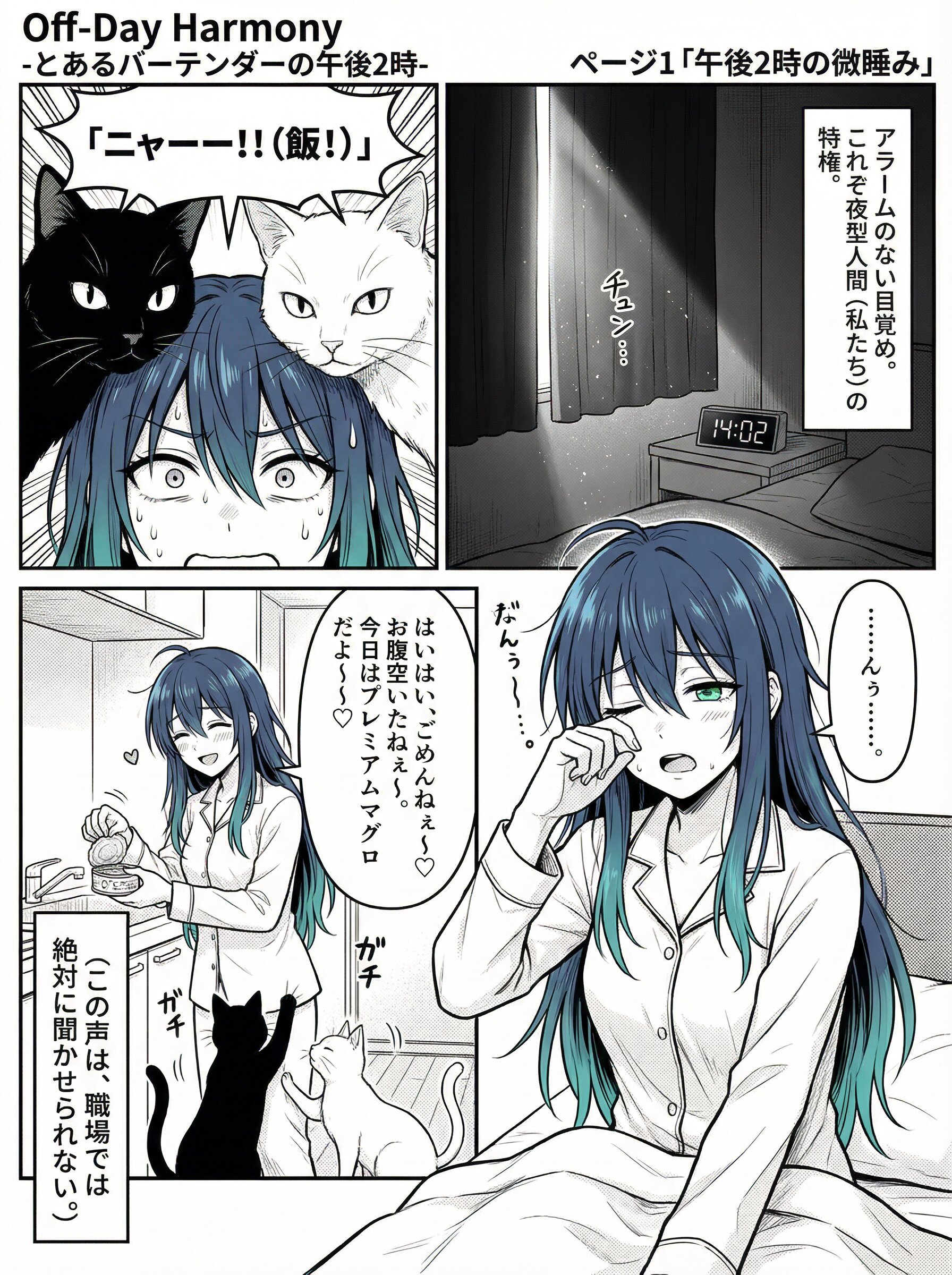 『Off-Day Harmony -とあるバーテンダーの午後2時-』(全6ページ+おまけ) ゆう 2025/11/26使用したAI その他 年齢制限 全年齢 いいね5 シェア #相川 月子 #オリジナル #漫画 #Bar_Moonlight この作品は、Bar Moonlightで深夜帯チーフを務める相川 月子(27歳)の「休日の完璧なルーティーン」に焦点を当てた短編漫画です プロンプト なし コメント 送信 ゆう 2024年10月より活動開始 268投稿103フォロー93フォロワー 初めまして! オリジナルキャラクターのイラストを投稿しています。高級バー「Bar Moonlight」で働く小柄で童顔なバーテンダー「月城鈴音」、クールビューティな「相川月子」、そして記念日が大好きな大学生「天宮祝」を中心に描いています。ComfyUIでの制作が多めです。キャラクターたちの日常を切り取った温かみのある作品を目指しています! フォローする 他の作品 全てを見る 雪と子猫の物語_短編 雪と子猫の物語 天使の一滴 - Ange for November 18th 夜道 KING 女帝 クールなファッションショー・ランウェイモデル 王座に君臨する絶対支配者 黒薔薇のカリスマパフォーマー 暗黒薔薇うさぎ姫 水中遊泳:深海を駆ける黒薔薇姫 夏の輝き:海辺水遊び 王家の輝星:ブルーベリーロワイヤル嬢の華麗なる肖像 雨音の中の帰路 職業病は日常にも フルーツタルト♪ いつまでも待ってるよ... 氷室胡蝶の内面 もっと見る