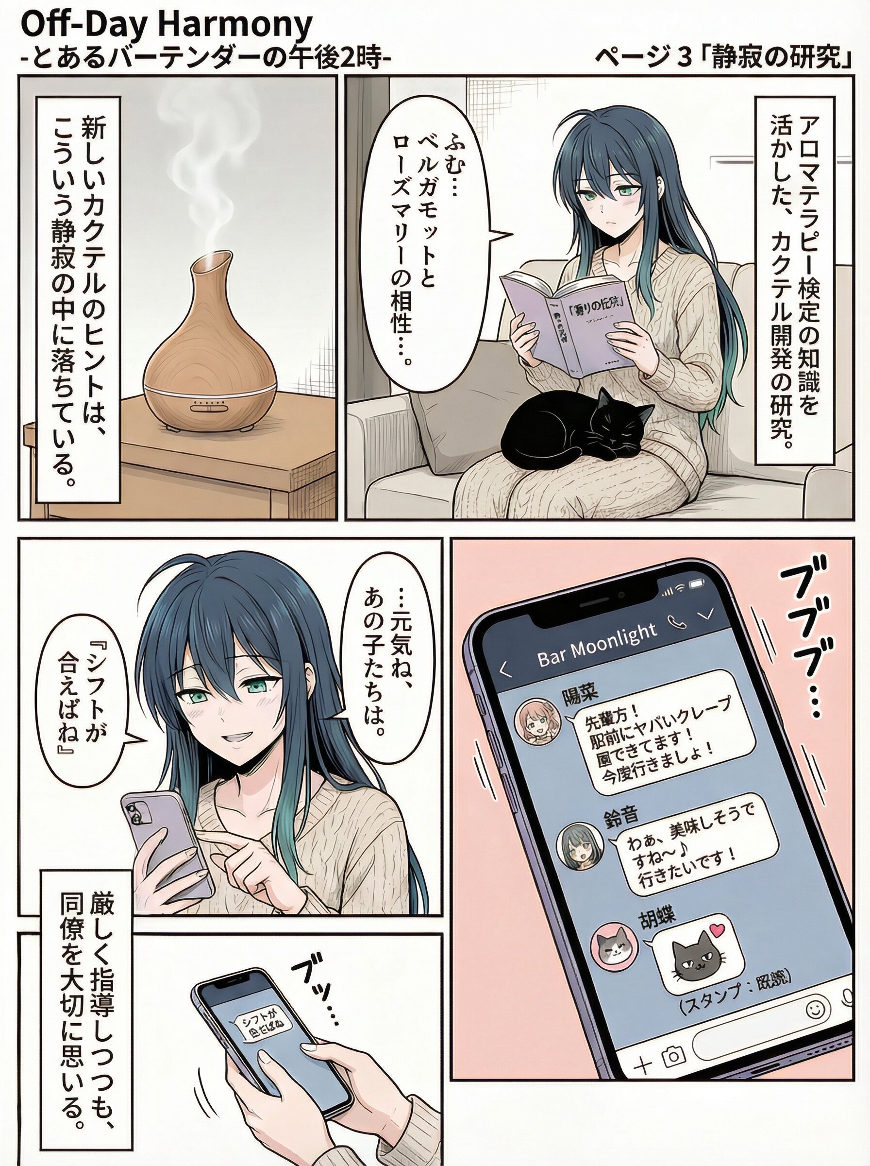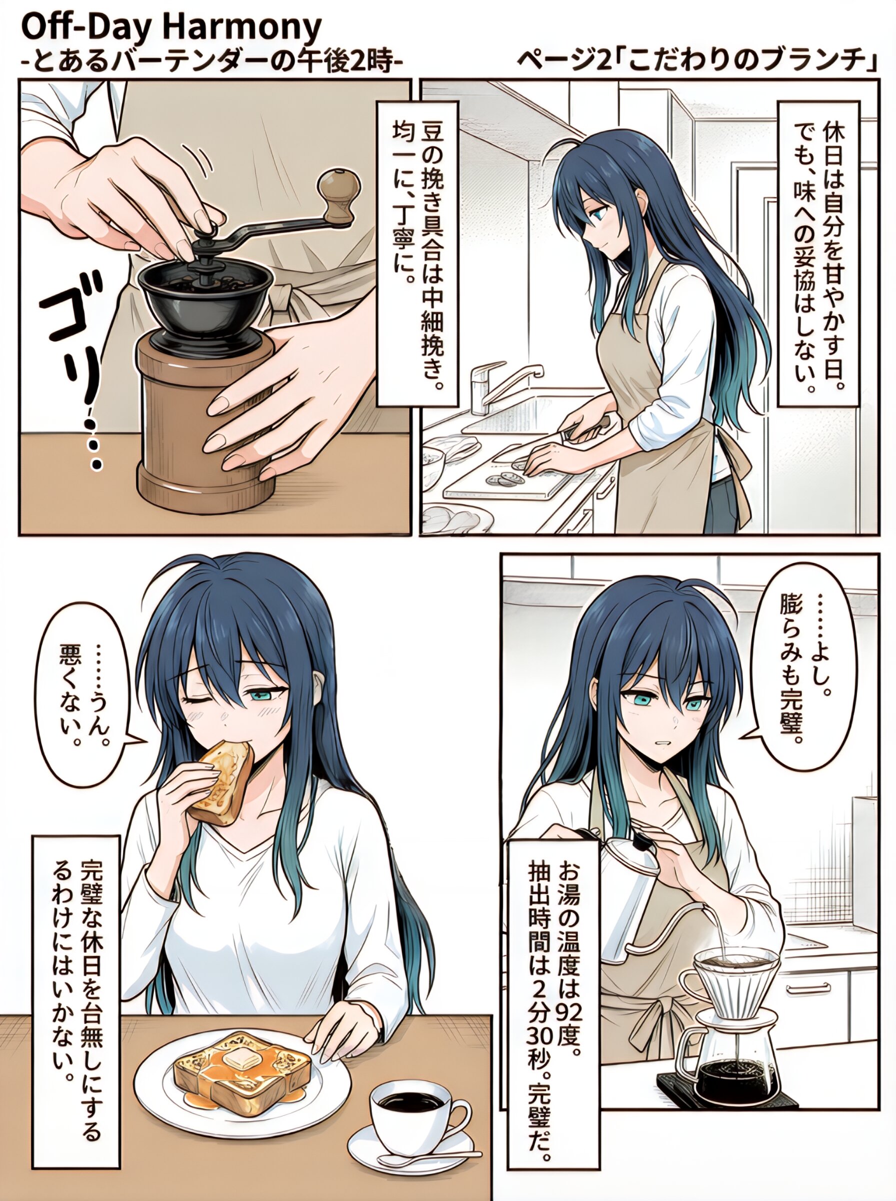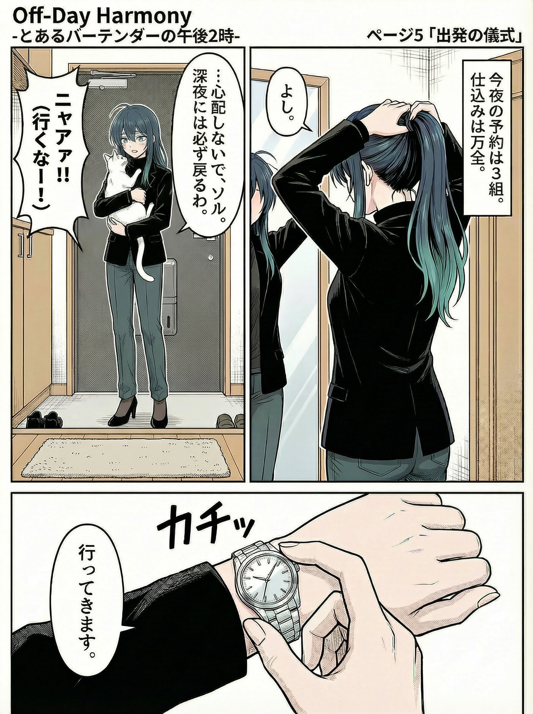 『Off-Day Harmony -とあるバーテンダーの午後2時-』(全6ページ+おまけ) ゆう 2025/11/26使用したAI その他 年齢制限 全年齢 いいね5 シェア #相川 月子 #オリジナル #漫画 #Bar_Moonlight この作品は、Bar Moonlightで深夜帯チーフを務める相川 月子(27歳)の「休日の完璧なルーティーン」に焦点を当てた短編漫画です プロンプト なし コメント 送信 ゆう 2024年10月より活動開始 268投稿103フォロー93フォロワー 初めまして! オリジナルキャラクターのイラストを投稿しています。高級バー「Bar Moonlight」で働く小柄で童顔なバーテンダー「月城鈴音」、クールビューティな「相川月子」、そして記念日が大好きな大学生「天宮祝」を中心に描いています。ComfyUIでの制作が多めです。キャラクターたちの日常を切り取った温かみのある作品を目指しています! フォローする 他の作品 全てを見る 雪と子猫の物語_短編 雪と子猫の物語 天使の一滴 - Ange for November 18th 夜道 KING 女帝 クールなファッションショー・ランウェイモデル 王座に君臨する絶対支配者 黒薔薇のカリスマパフォーマー 暗黒薔薇うさぎ姫 水中遊泳:深海を駆ける黒薔薇姫 夏の輝き:海辺水遊び 王家の輝星:ブルーベリーロワイヤル嬢の華麗なる肖像 雨音の中の帰路 職業病は日常にも フルーツタルト♪ いつまでも待ってるよ... 氷室胡蝶の内面 もっと見る