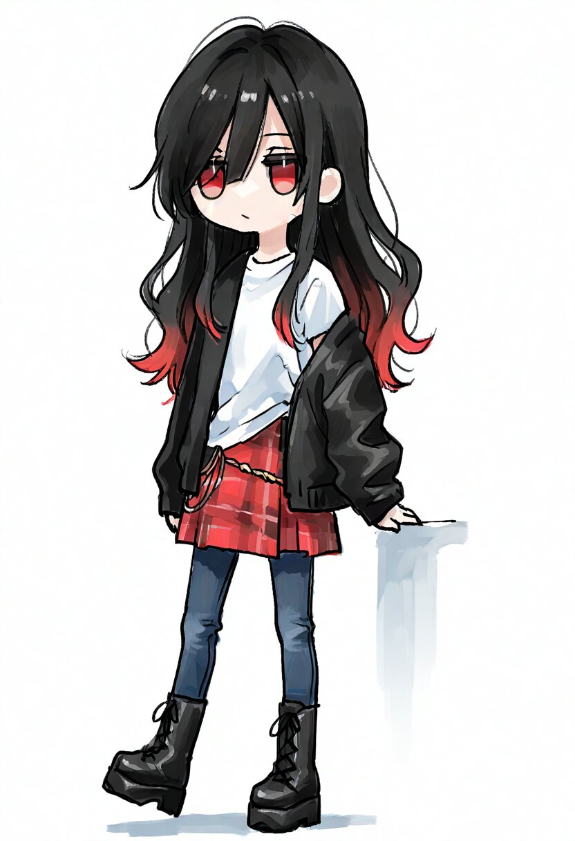 <lora:inmnstyleilxl:0.9>, best quality, masterpiece, very aesthetic, watercolor painting, general, 1girl, chibi, solo, black hair, long hair, wavy hair, long bangs, red colored tips, red eyes, jitome, black jacket, offshoulder jacket, white t-shirt, red plaid skirt, hip chain, skinny jeans, black platform boots, white background