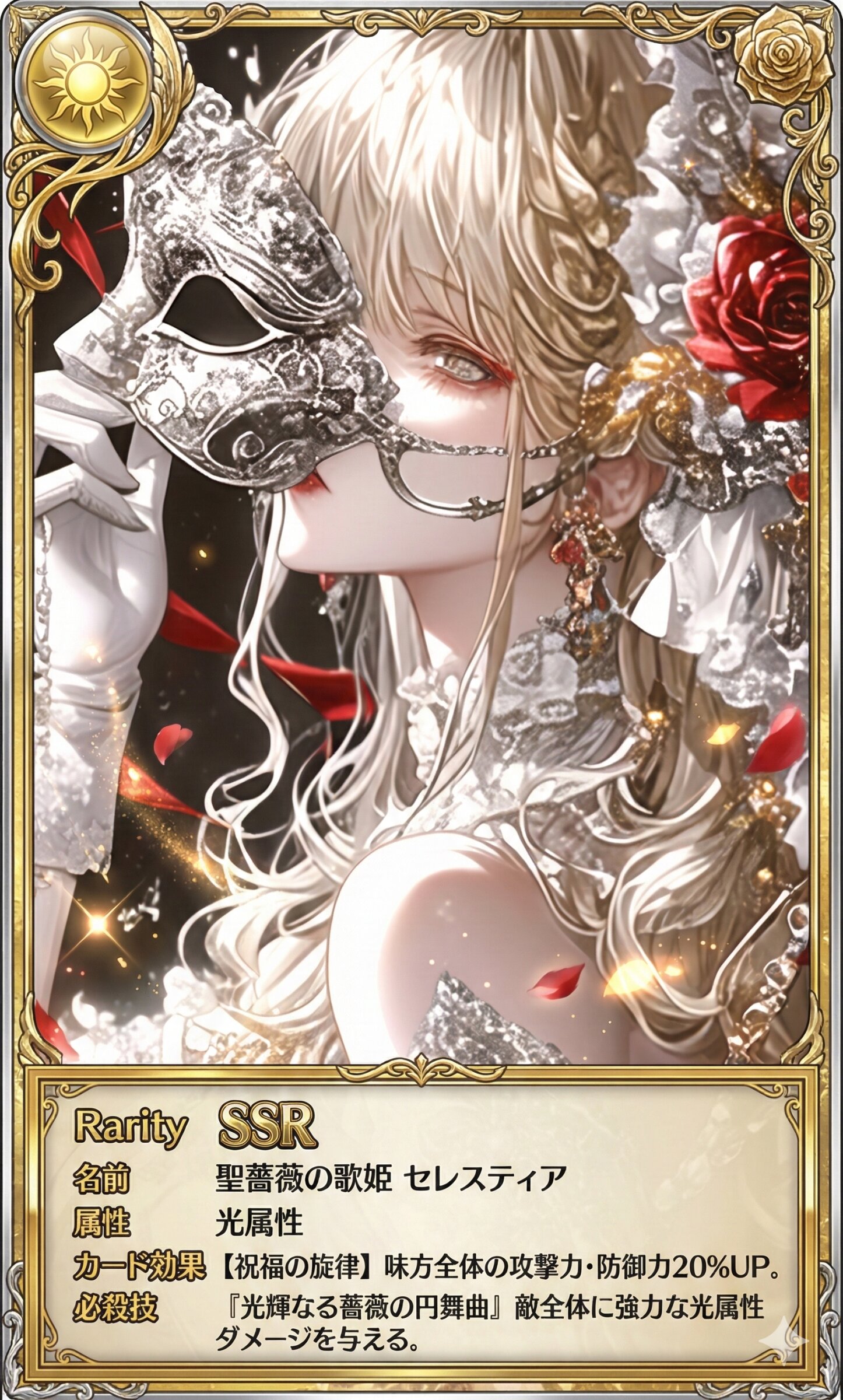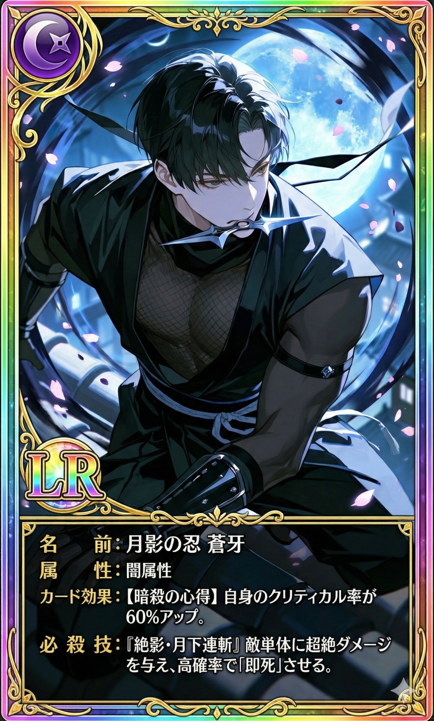 (social game card:1.4), (anime card game:1.3), (game ui:1.3), (stats window:1.2), (Japanese anime style:1.2), detailed character illustration, text box at bottom, element icon in top corner high definition, vivid colors, ray tracing Detailed card border, complex details, dynamic lighting, Greg Rutkowski's illustration, Rarity: LR, SSR, SR, R, in that order. Please assign randomly based on the atmosphere. Please output the following in Japanese. Name: Create based on the illustration's atmosphere Attribute: Set using Light, Dark, Water, Fire, Earth, plus Yin-Yang and the Five Elements. Card Effect: Add card game-like wording and include a special move. Set the card border according to rarity: rainbow, gold, silver, standard frame, etc. Also adjust the background effect within the card to match the rarity.
