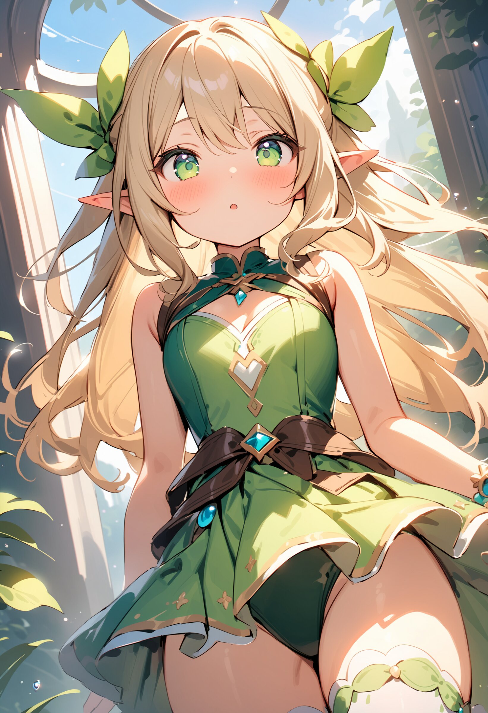 ((masterpiece)), ((best quality)), ((kawaii)), cute, (lovely), ((extremely detailed)), (beautiful), dynamic angle, a cute girl, 1girl, solo, ((elf )),beautiful blond hair, beautiful green eyes, ((beautiful eyes)), long hair, fantasy clothes,