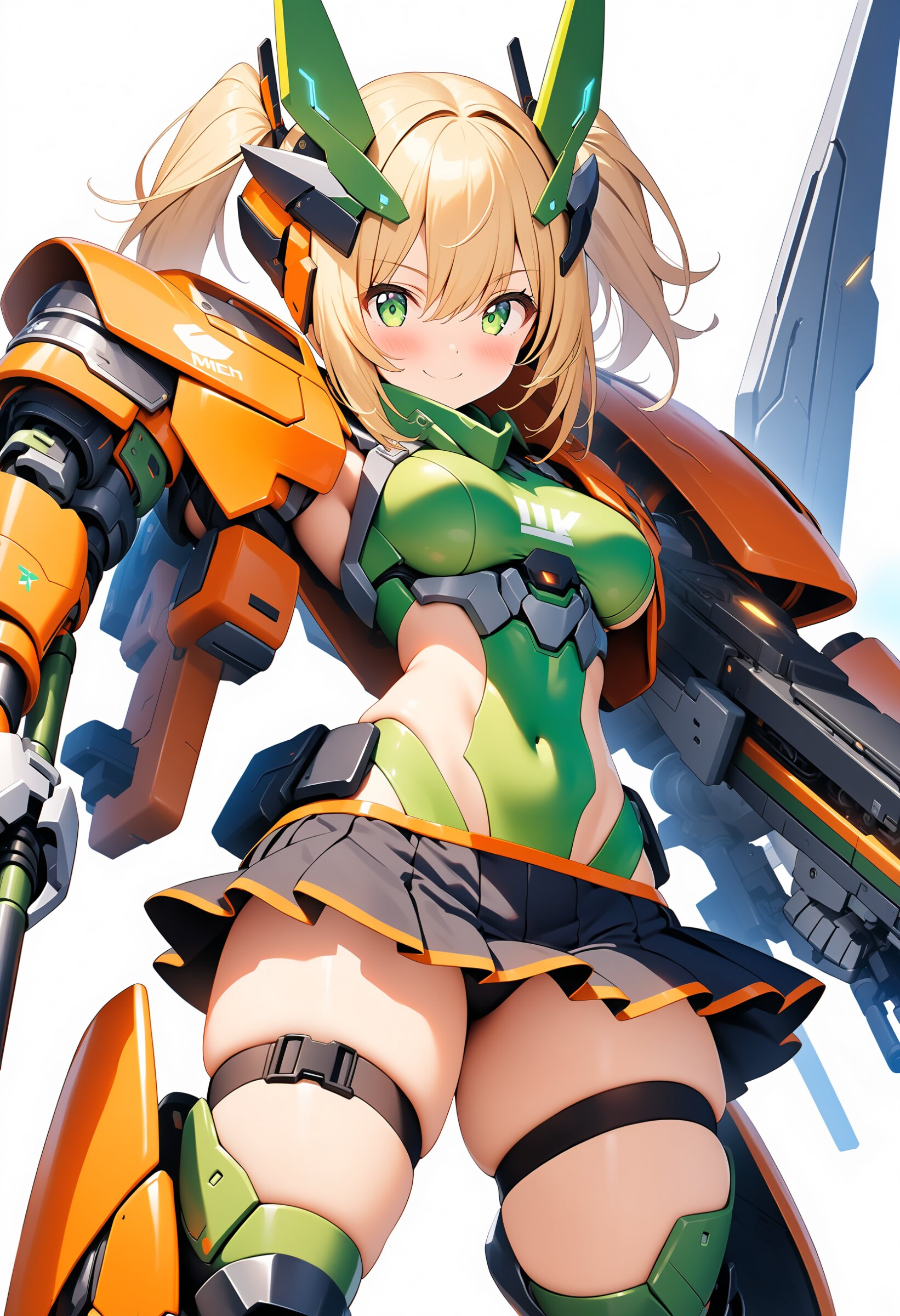 1girl, ((white background)), ultra detailed 8k cg render, masterpiece, high resolution, extremely detailed, mecha musume,mecha shoulder, mech leg, headgear, mecha armor, ((mini skirt)),long blonde hair, dropping green eyes, smile, dynamic posing,