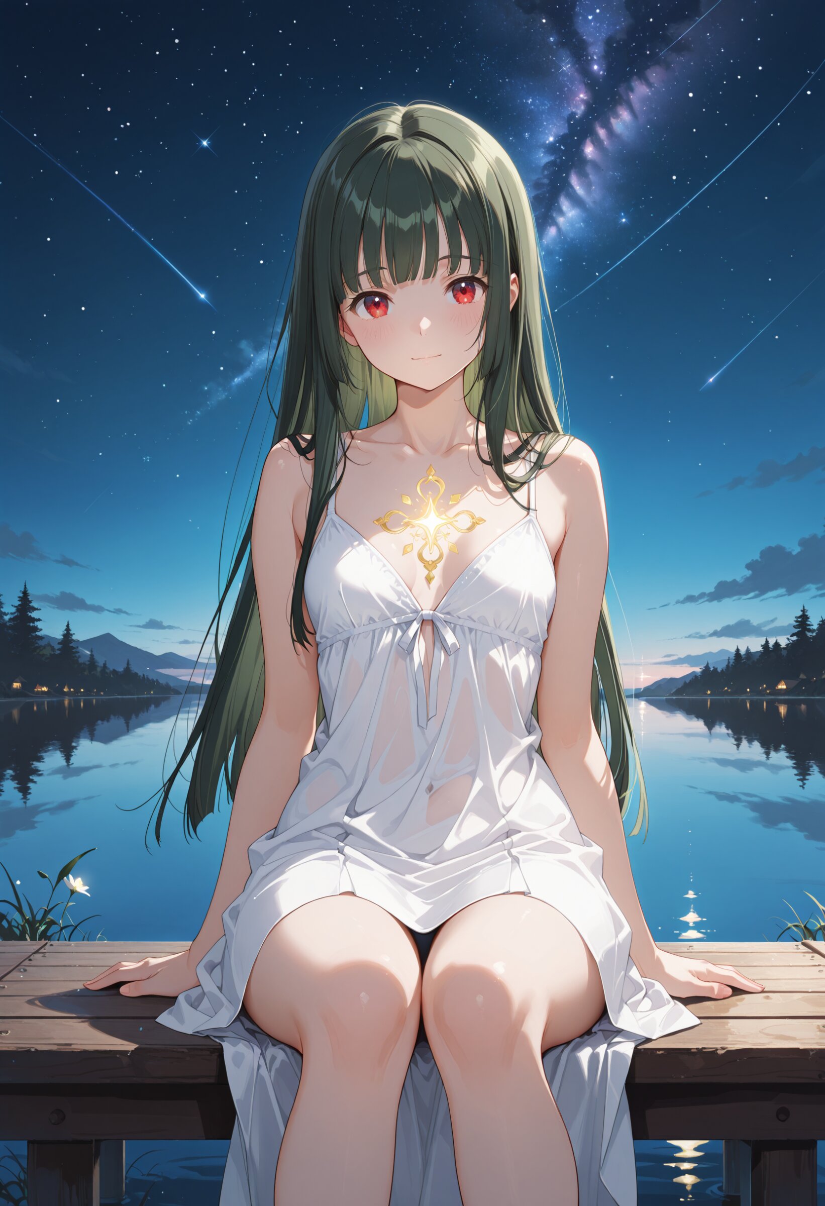 masterpiece, best quality, ultra-detailed, high resolution, perfect anatomy, beautiful detailed eyes, beautiful detailed face, a girl sitting on a pier under a starry night sky, gazing at the shimmering reflection of stars on the lake, quiet night breeze, soft moonlight illuminating her silhouette, magical and peaceful scene, dark green hair, long hair, hime cut, red eyes glowing softly, small breasts, gentle expression, thin outerwear fluttering slightly, high-contrast lighting, tranquil atmosphere