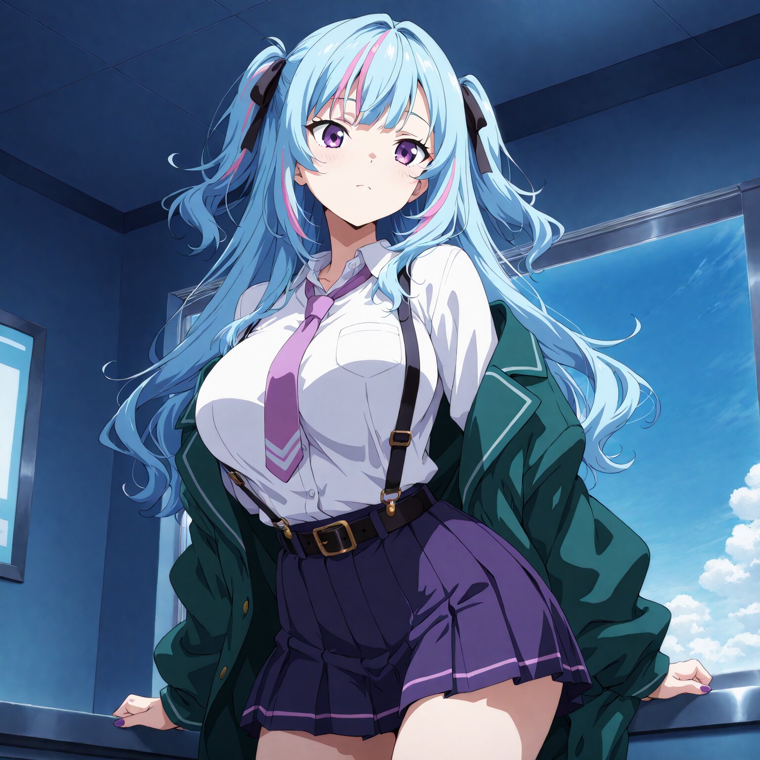 (1girl) (blue hair:1.3), long hair, two-sided updo, (pink streaked hair:1.3), black ribbon purple eyes, purple nails large breasts, belt, oversized jacket, suspenders School uniform, green blazer, dress shirt, tie Pleated skirts, mini skirts, BREAK, ((newest, anime, animation, anime screen capture, anime style:1.3)) BREAK, ((masterpiece, , vibrant, very aesthetic, highly detailed, best quality, 16k:1.3)) perfect fingers,