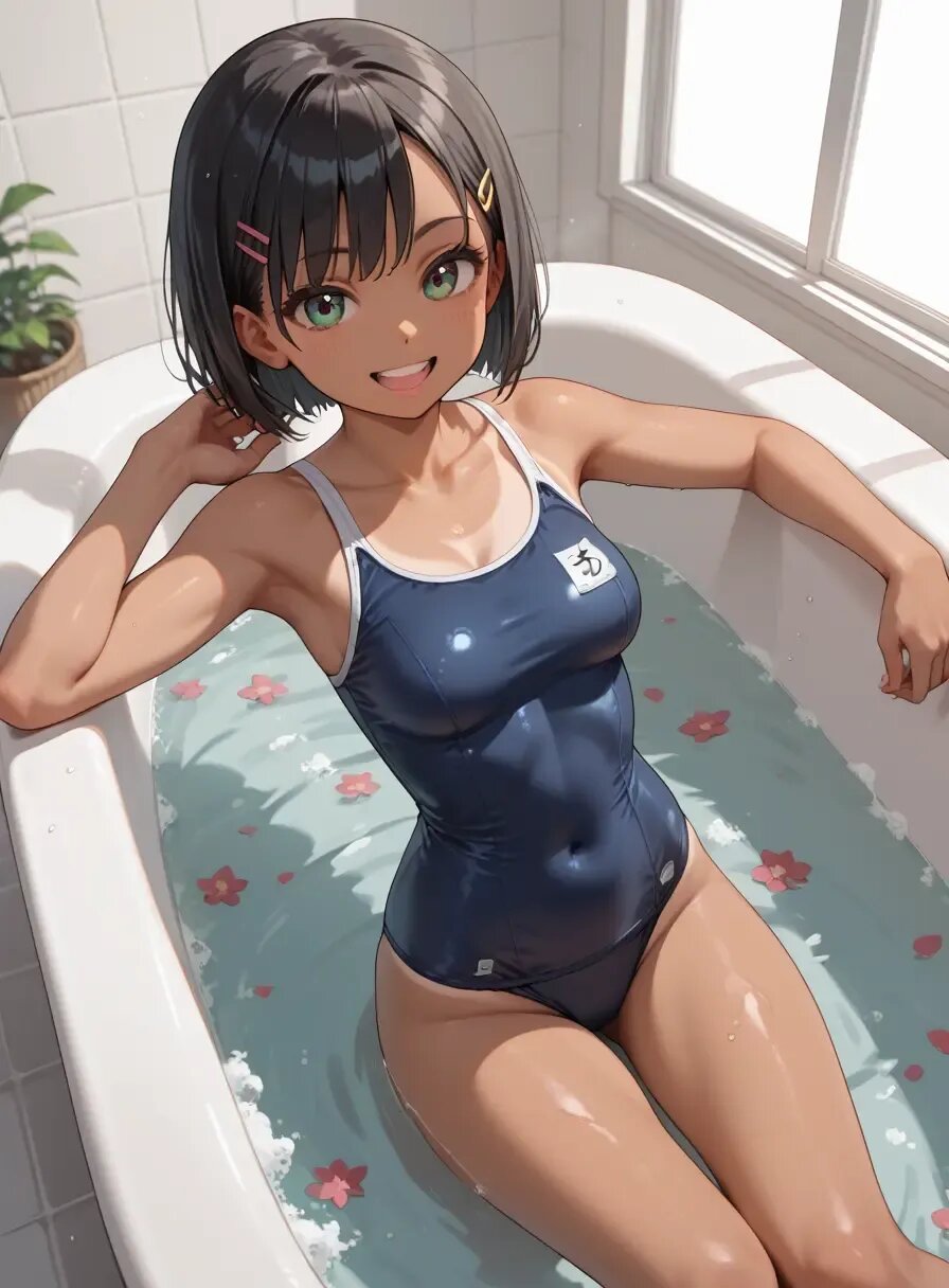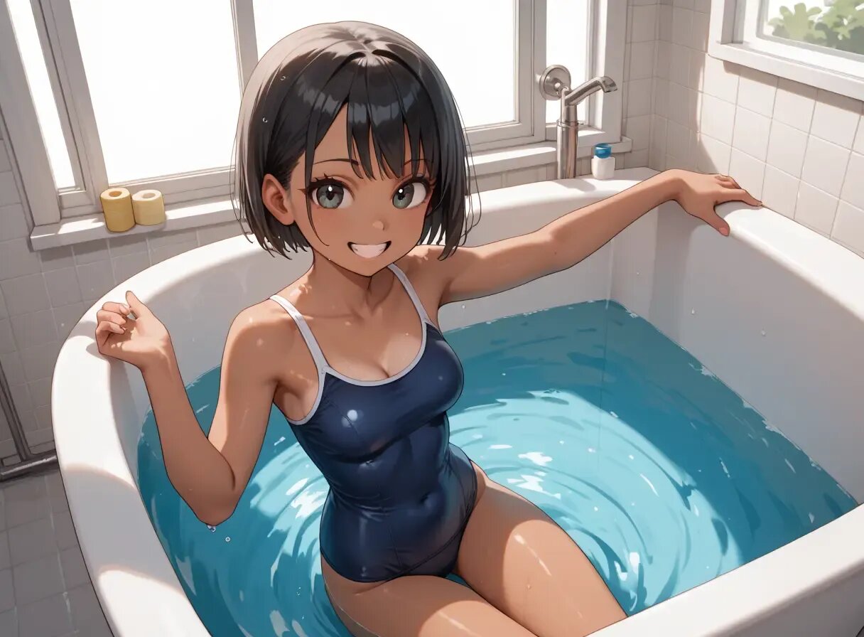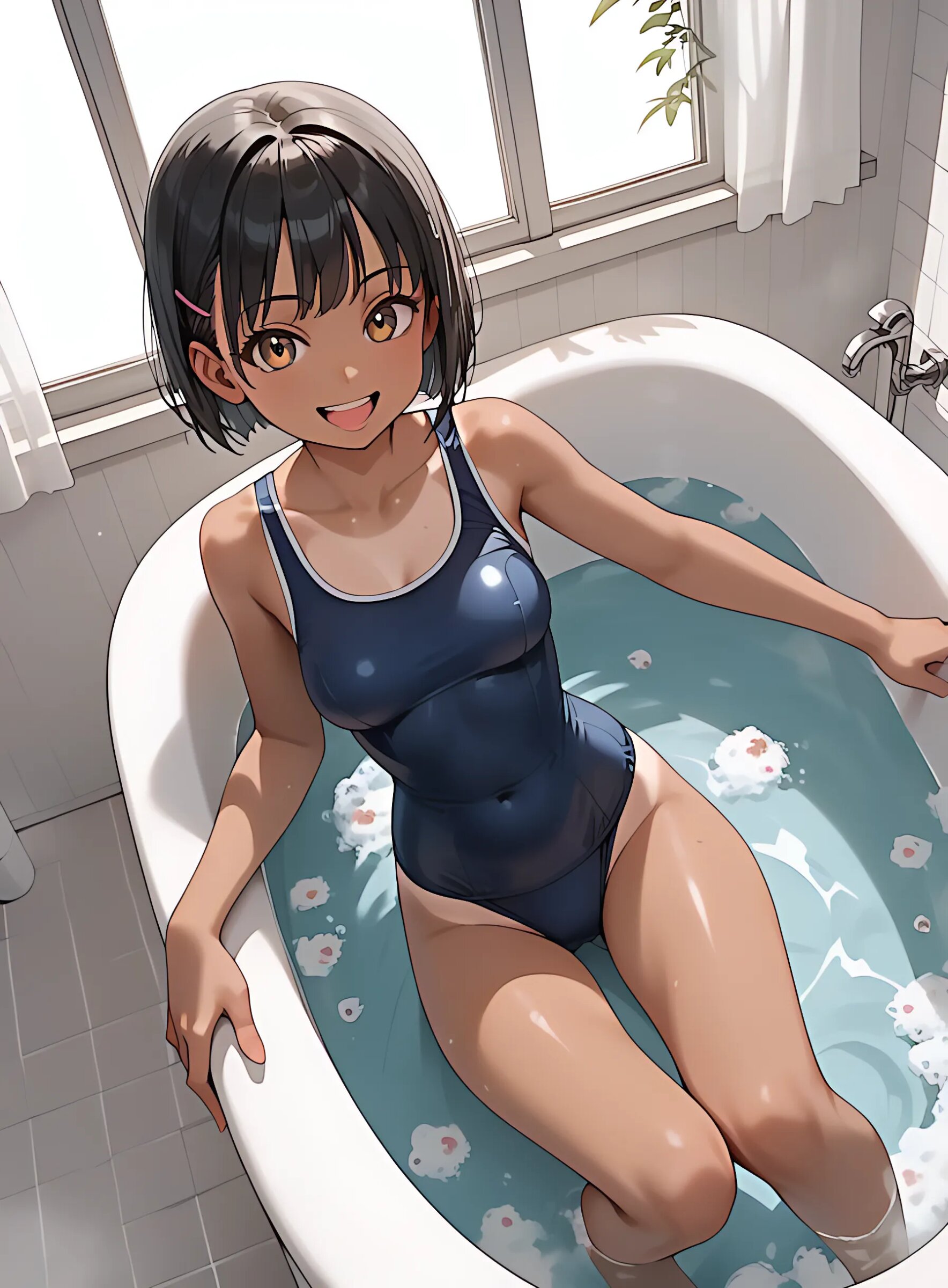 looking_at_viewer,depth of field,from_above,dynamic_angle,:d,happy,1girl,mesugaki,early teen,loli,tan,slender,black hair,short hair,medium breasts,narrow_waist,giggling,A bathroom with white tile walls, a girl bathing in a white bathtub, a navy blue school swimsuit, natural light coming in through the window, daytime,one_leg_up,not_Bubble