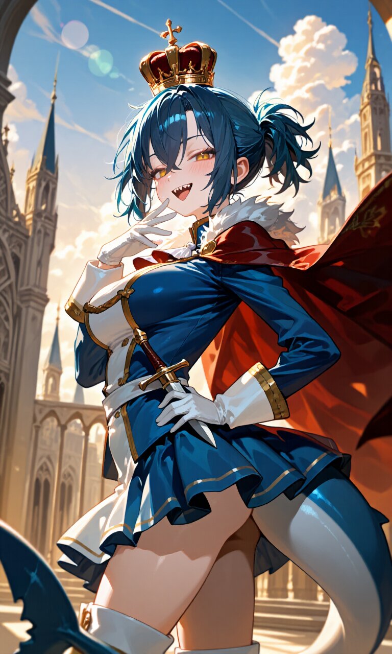 1girl, a stunning young woman with deep blue messy hair styled in a short ponytail and crossed bangs gazes at the viewer with a smug expression, her slanted yellow eyes squinting slightly. Her beautiful, delicate face is flushed with a light blush, and her open mouth reveals sharp teeth in a playful smirk. She has a slender, skinny body with a narrow waist, (big breasts), thin thighs, and a {{small bottom}}, accentuated by her (Marine Blue luxurious Prince costume:1.6) featuring long sleeves, a (luxurious mini skirt:1.4), and (White luxurious Boots:1.3). A (Dark Red luxurious Cape:1.3) flows dramatically behind her, and she wears a (luxurious crown:1.4) atop her head, along with (White gloves:1.2). A (dagger on waist:1.3) completes her regal yet dangerous look. Her lower half transitions into a sleek shark tail, adding a mythical touch. The setting is a grand palace with intricate Gothic architecture, bathed in warm afternoon sunlight. The blue sky is dotted with cumulonimbus clouds, and shining lights create a soft lens flare, enhancing the romantic academia atmosphere. The light, airy ambiance contrasts with her sharp, mischievous demeanor, making the scene both elegant and dynamic. The artwork is a masterpiece with insanely detailed skin, hair, and clothing, rendered in 16K quality for breathtaking realism.