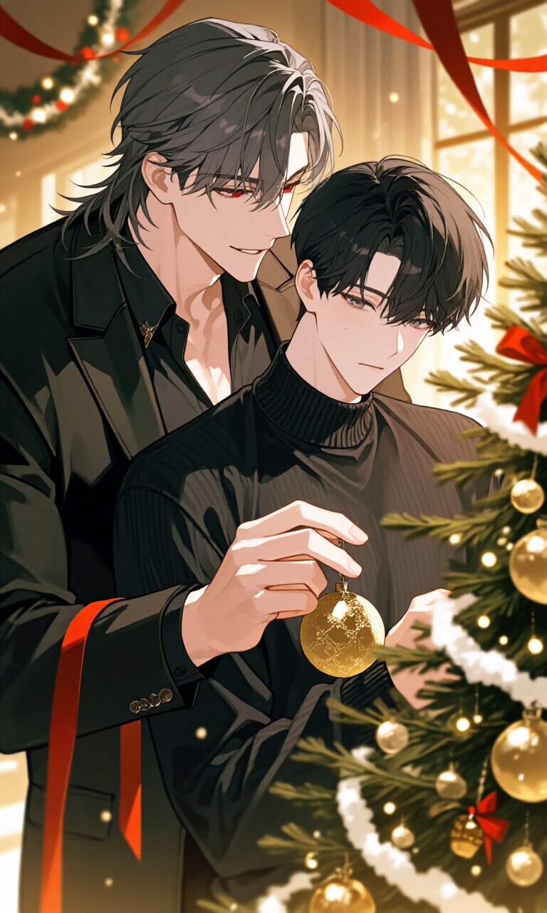 Two young men decorate a Christmas tree together in a romantic scene. The first is a dangerously charming, mature Chinese man (36 years old), long grayish-black hair swept back, sharp red eyes, confident smile, wearing a slightly relaxed version of a luxury black tuxedo jacket, with an open-collar black silk shirt underneath, muscular physique subtly visible, elegant yet sensual. He gently leans toward and embraces the other man from behind, guiding his hands as they hang ornaments together, holding a Christmas ornament instead of a rose. The second is a delicate and refined young Japanese man, short soft black hair parted slightly to the side, pale skin, calm thoughtful expression with a hint of flustered surprise, wearing a thin black knit with subtle texture, casual yet sophisticated, clean and minimalist. They stand close together beside a glowing Christmas tree, soft warm lights, red ribbons, gold ornaments, white garlands, gentle lighting, festive atmosphere, subtle sparkle effects, anime-style, high-definition, ultra-detailed fabric and realistic folds, clean line art, romantic but classy mood, not exaggerated, no over-decoration around them.
