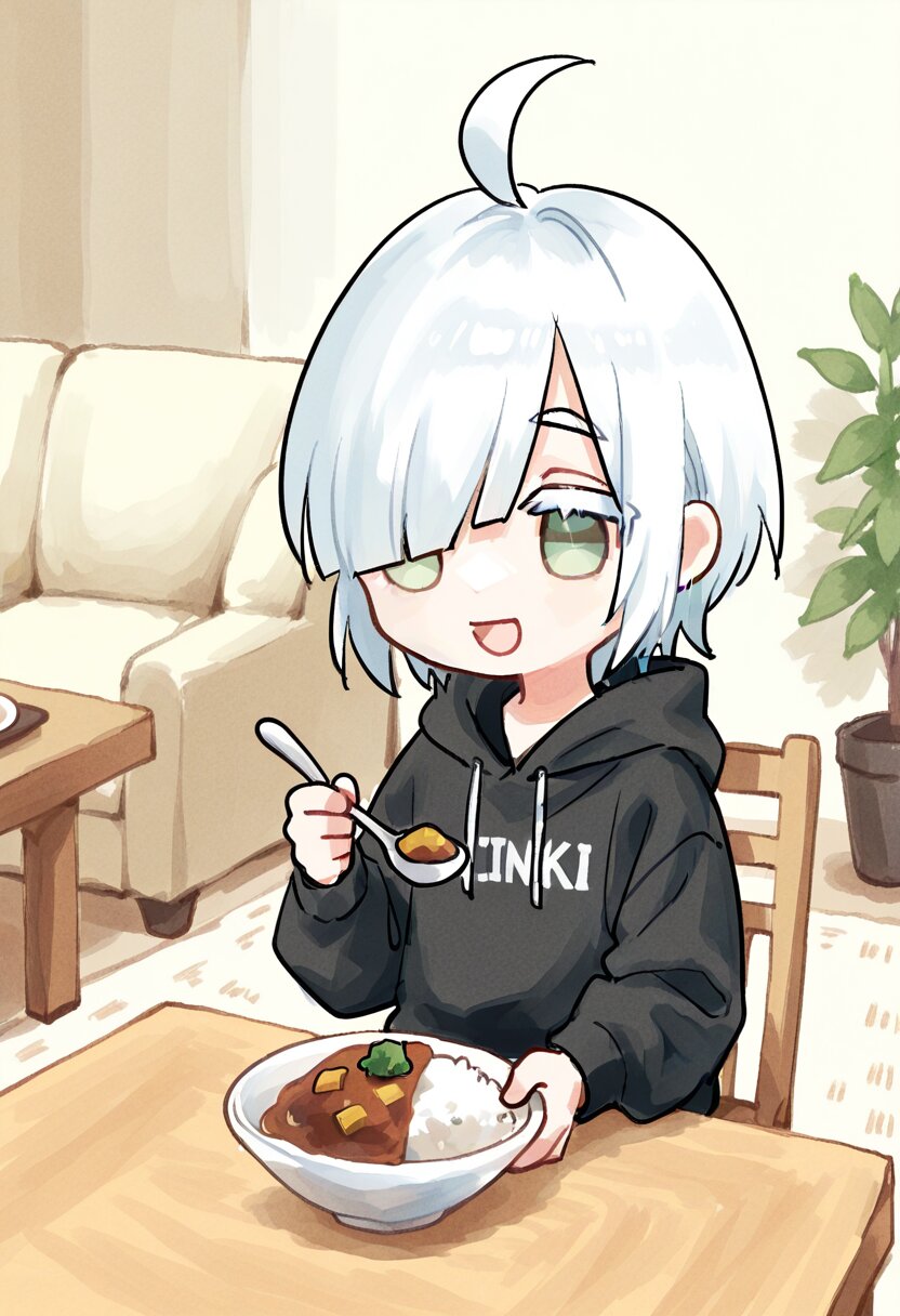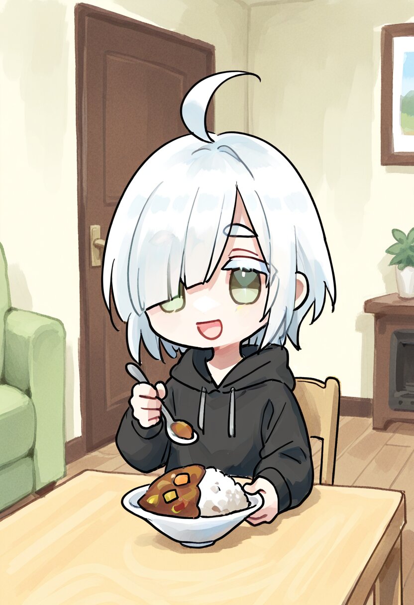 <lora:inmnstyleilxl:0.9>, best quality, masterpiece, very aesthetic, watercolor painting, general, 1girl, chibi, solo, (bright white hair), short hair, blunt bangs, white thick eyebrow, white colored eyelashes, (hair over one eye), ahoge, mintgreen eyes, oversize black hoodie, holding spoon, curry rice, table, sitting chair, living room, smile, open mouth