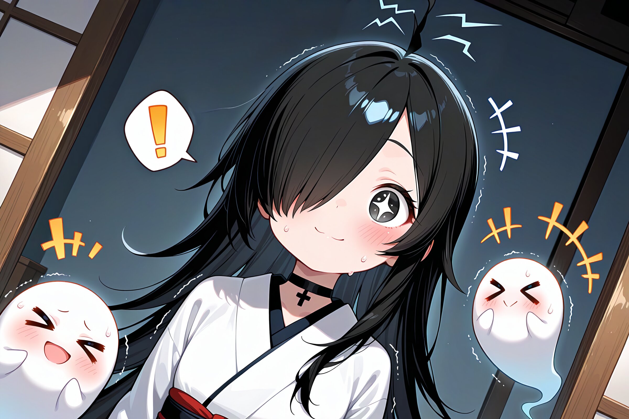 1 little girl, solo, diagonal angle, upper body, masterpiece, best quality, amazing quality, very aesthetic, single strand of hair, upward hair, sharp ahoge, dynamic hair, tension hair, shout lines, black hair, long hair, (hair over one eye:1.2), black eyes, +_+, closed mouth, smile, cheerful, +++, notice lines, @_@, chestnut mouth, confused, blush, tearful, spoken exclamation mark, trembling, sweat, choker, white kimono, ghost, > <, japanese room,