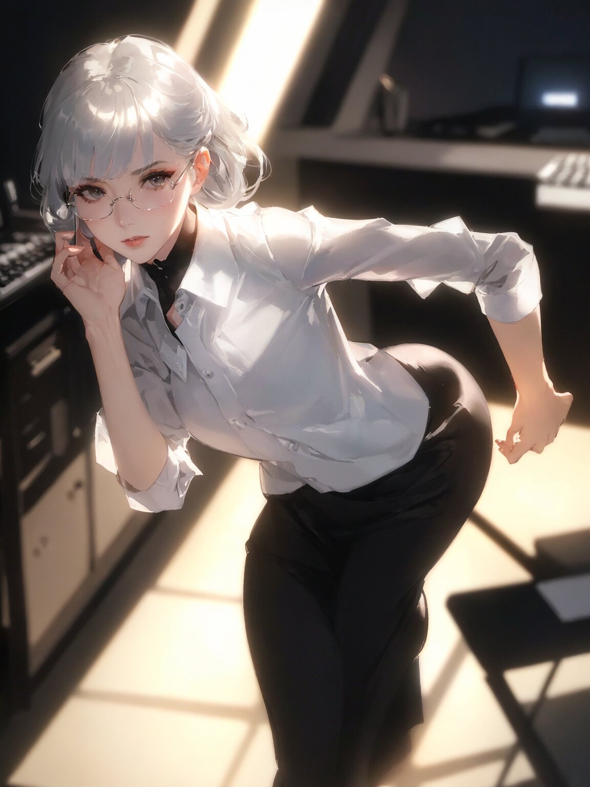 ((8k,delicate facial features, ultra high res, best quality, masterpiece:1.2,perfect anatomy:1.1,super detailed skin,textile shading,)) (1girl,pale skin,solo), (action,) office worker,slender,legs focus,,black pantyhose,side shot,night,lump,loafer,glossy hime cut,long blunt bangs,silver glasses,((head out of frame,))typing pc's keyboard,full makeup,small breast,depth of field,cinematic lighting,cinematic shadows,cinematic angle,cinematic pose,
