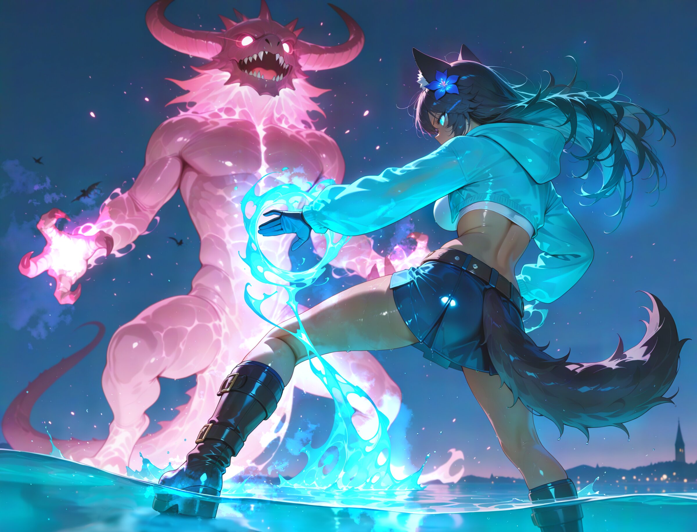 hip focus from below from behind facing away, looking at monster 1girl, black wolf ears, dark skin, young beautiful girl, large breasts, tall, wolf tail, (aristocratic features), (Black Hair:1.2) (disheveled long hair over ears:1.3) messy hair ornament flower, (perfect turquoise eyes:1.3) long eyelashes,, wearing turquoise hood down and white tube top leather gloves, lether miniskirt, belt boots, turquoise hoodie, water magic, , kung fu attack, kung fu pose, kung fu action, (swirling energy,energy magic,energy:1.2), water magic, partially underwater shot, partially submerged, great clear water, reflective water, , medieval fantasy world, battle (huge scarlet silhouette of mouse monster, faceless monster:1.3), (scarlet monster:1.2), duel, fighting, danmaku, incoming attack, super fine concept art, hard surface, 8K, unreal engine, masterpiece, best quality, amazing quality, very aesthetic, absurdres you can add scenery, (volumetric lighting), To make the background more distinctive. professional art lots of details, , overexposure, shiny-glistening, (watercolor style:0.0), (pastel color style:1.0) 4ur4_illu,shiny, glowing, glowing particles, glowing light particles, light particles, , <lora:noline (1):-0.5> <lora:sdxl2-flat2-512b:0.2> <lora:facelightup_xl_v10:0.5> <lora:V2_yakumo_alchemy:0.5> <lora:Aura_illu:0.1>