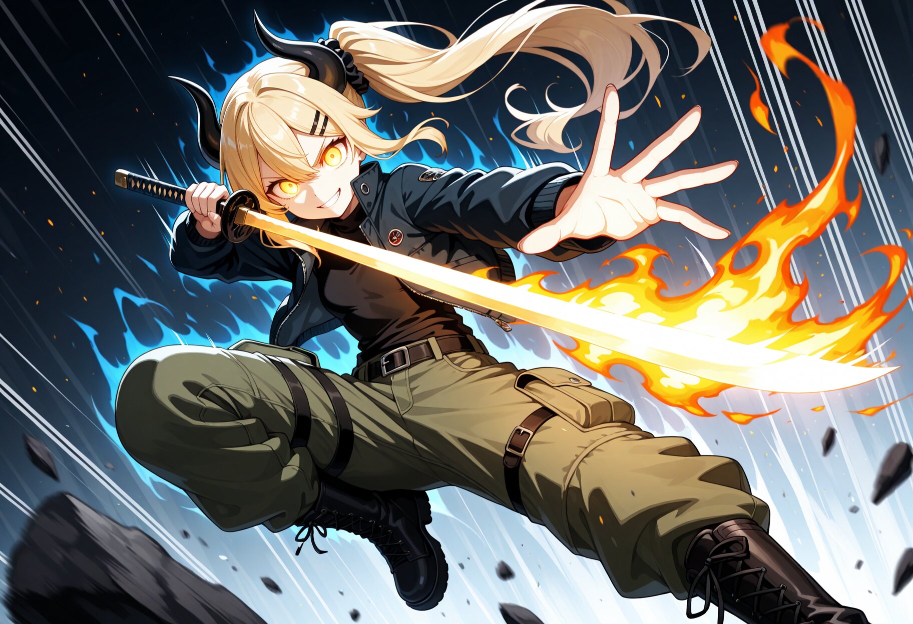 masterpiece,best quality,highres,ultra detailed,highly detailed,detailed eyes,perfect anatomy,general,1girl,solo,17yo,teenage,cute,(holding huge glowing fire katana,reaching tip of katana,fighting stance,action,motion lines,motion blur,speed lines,aura,side ponytail,wind,jumping:1.2),(two demon horns,black horns),demon girl,small breasts,blonde hair,long hair,hair scrunchie,hairclip,yellow eyes,glowing eyes,closed mouth,light smile,grin,angry,(jacket,long sleeves,long cargo pants),belt,boots,slender girl,fantasy,from below,in the air,dutch angle,