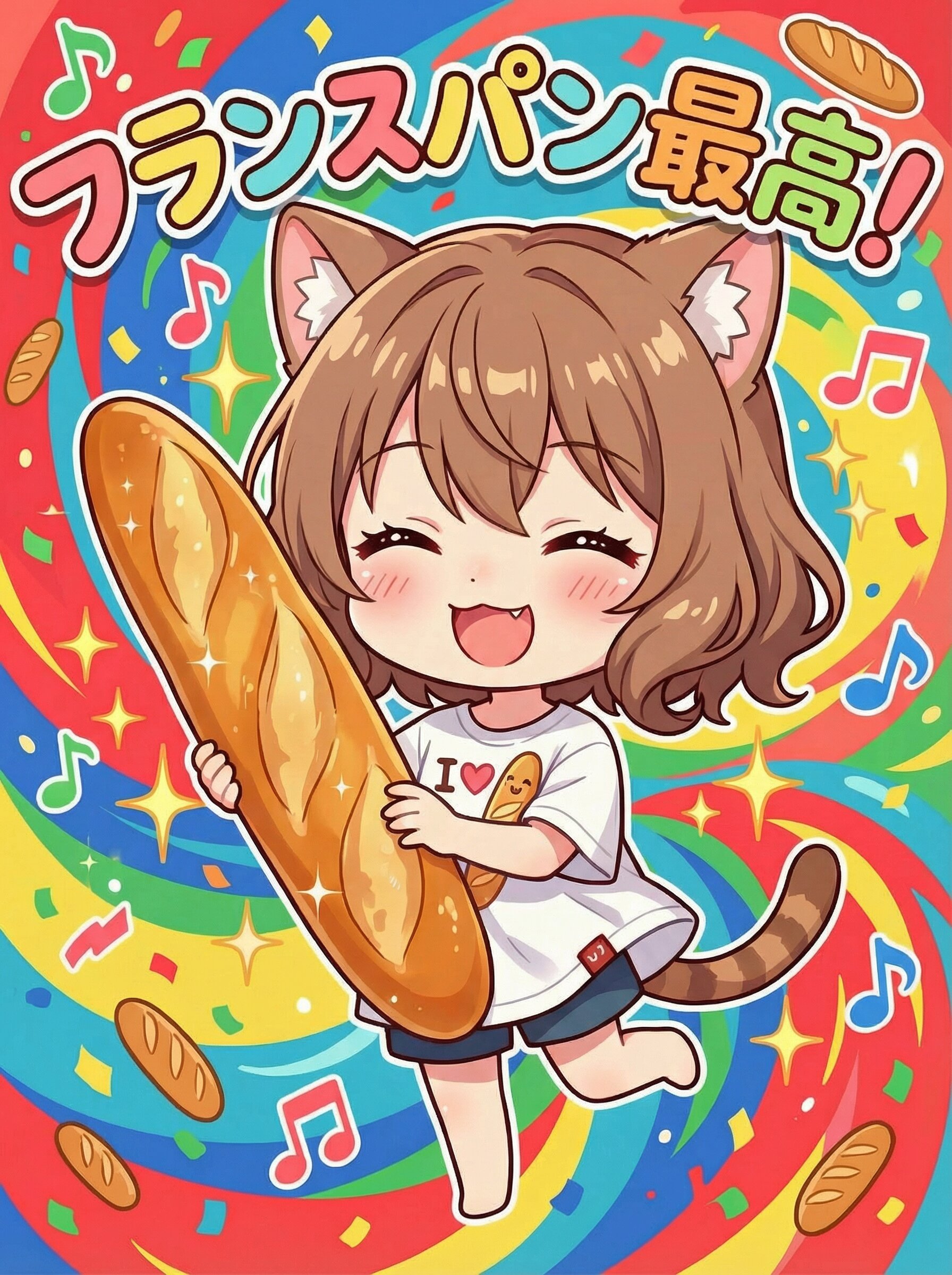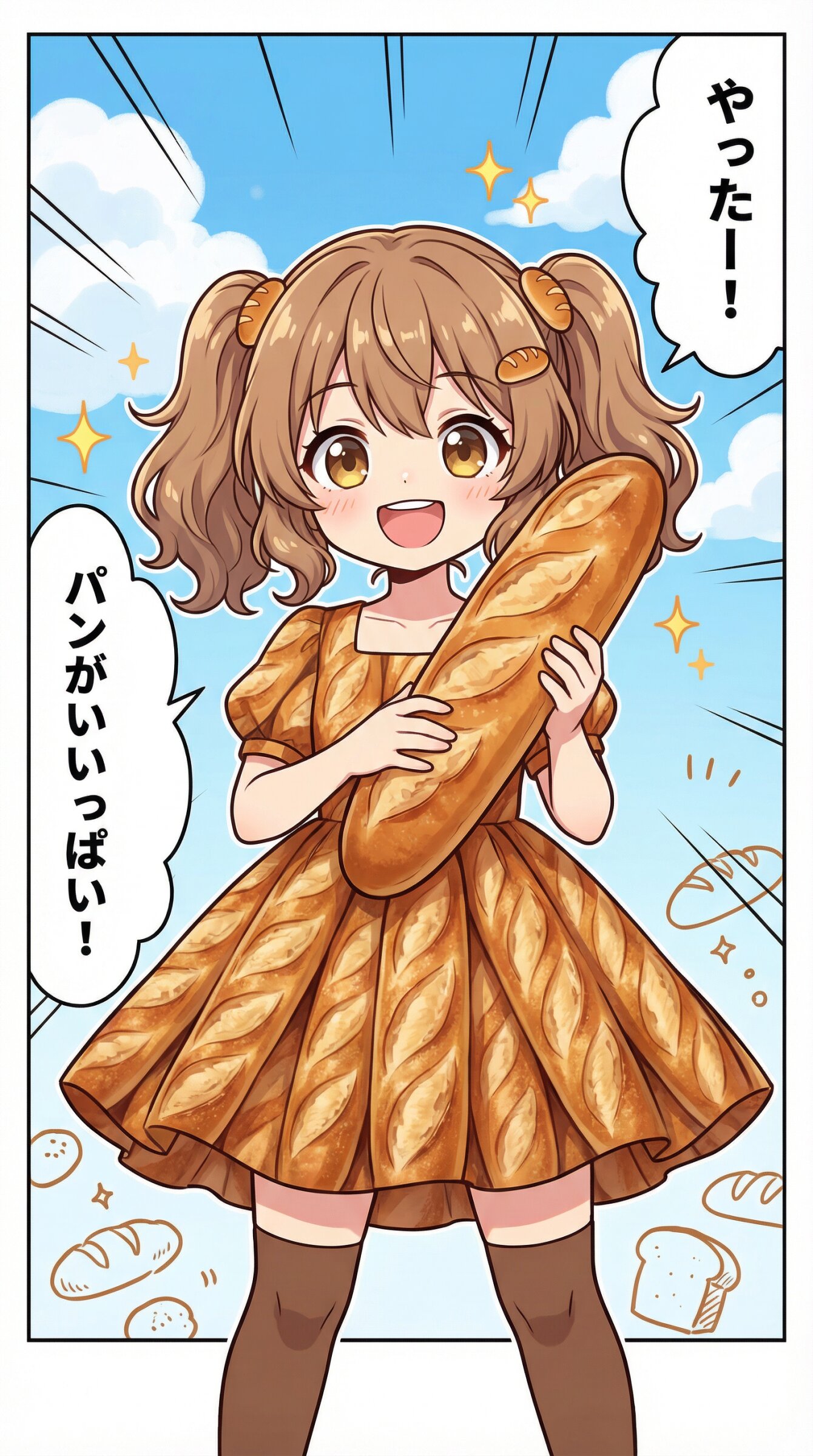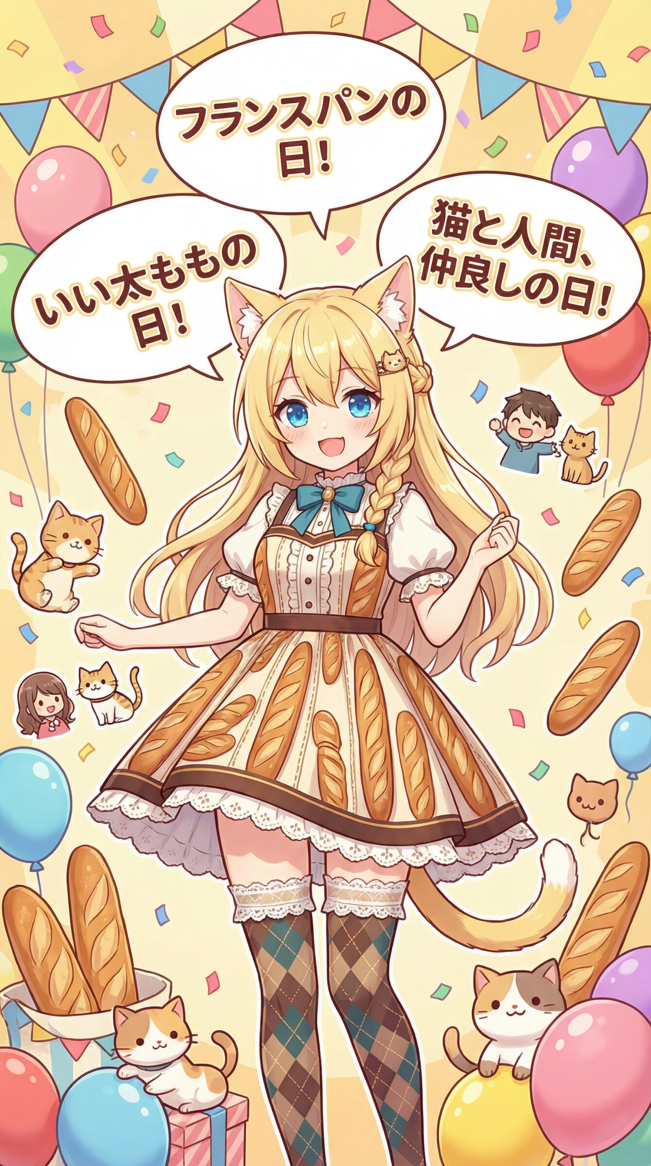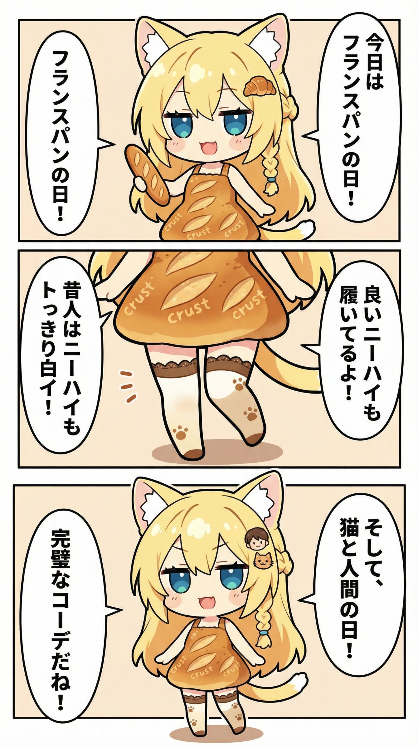 フランスパンの日【いい(11)フ(2)ランスパ(8)ン】 いいニーハイの日【いい(11)ニー(2)ハイ(8)】 猫と人の日【いい(11)ニャ(28)】 これらをネタに、この子が主役のユニークな短編漫画を作って。セリフはすべて日本語。服はネタに合うものに着替えさせて。