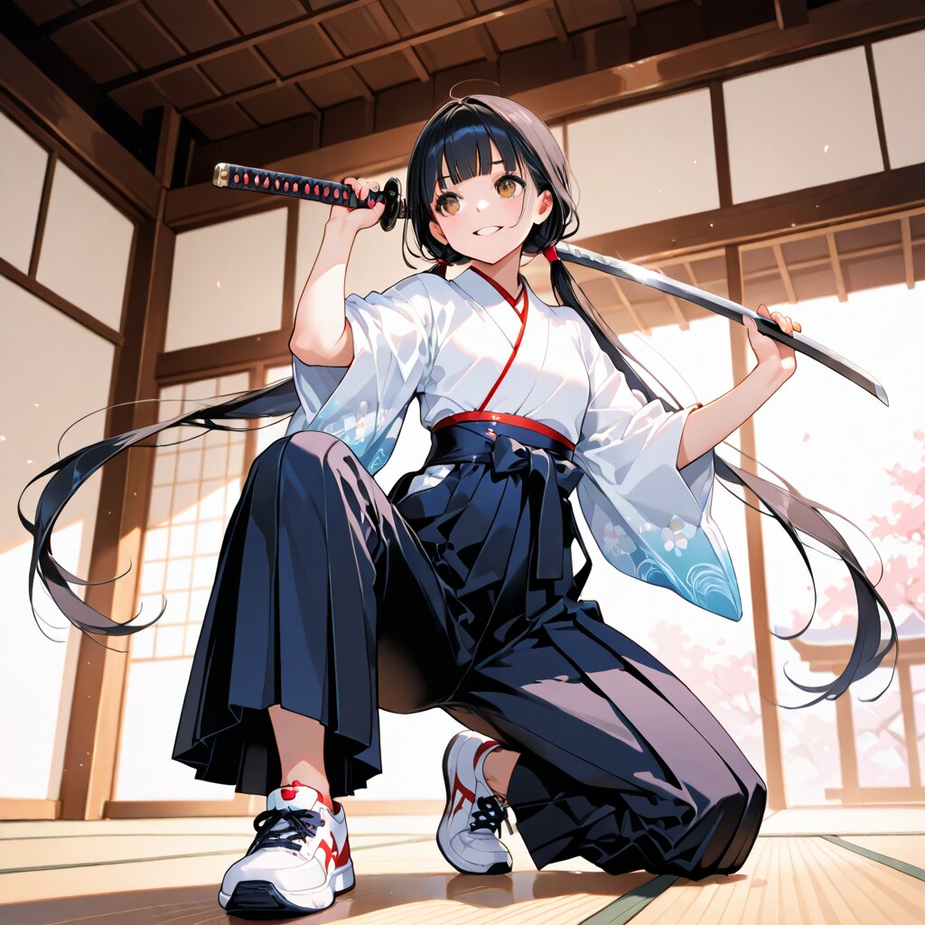 (rating: sensitive:1.2), score_9, score_8_up, score_7_up, score_6_up, NSFW, source_anime, (delicate illustration), in flat color style illustration. (perspective, foreshortening, super dynamic angle from below, sneaker), diagonal view. a girl, samurai girl, squatting and kneeling on the floor, one knee, spread legs on front and back, sneakers, Japanese hakama, long hakama, holding a sword, Japanese katana, motion blur, low twin-tails hair, absurdly long twin-tails, floating hair, straight bangs, looking away. (fashion illustration, flat colors, ultra-intricate detailed), flat design, bold colors, patterned fabric, beautiful composition, in the style of cute anime girl. BREAK insanely beautiful and detailed kimono and hakama, extremely shiny hair, beautiful small face, big round eyes, beautiful detailed eyes, long eyelashes, double eyelids, parted lips, smile, kawaii, cute, (flat chest, covered pointy nipples:0.3), slender, {exquisitely delicate skin}. perfect anatomy, dynamic angle, dynamic pose, BREAK perfect AI rendering, three-quarter view, hyper-detailed, high contrast, ray tracing, best lighting, cinematic composition. BREAK (masterpiece, aesthetic quality, 8K, ultra-detailed), whimsical color palette, perfect design, amazing quality, high quality, absurdres, highres, flat lighting,