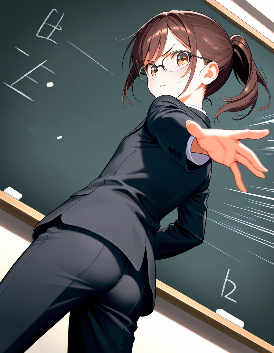 petite young female teacher who looks like a child,wearing glasses,dressed in a formal suit,standing in front of a blackboard,(throwing a piece of chalk toward the viewer:1.4),(slightly angry expression:0.8),dynamic action pose,dramatic perspective,classroom setting,high detail,motion blur,action lines,cowboy shot,from below,looking back,