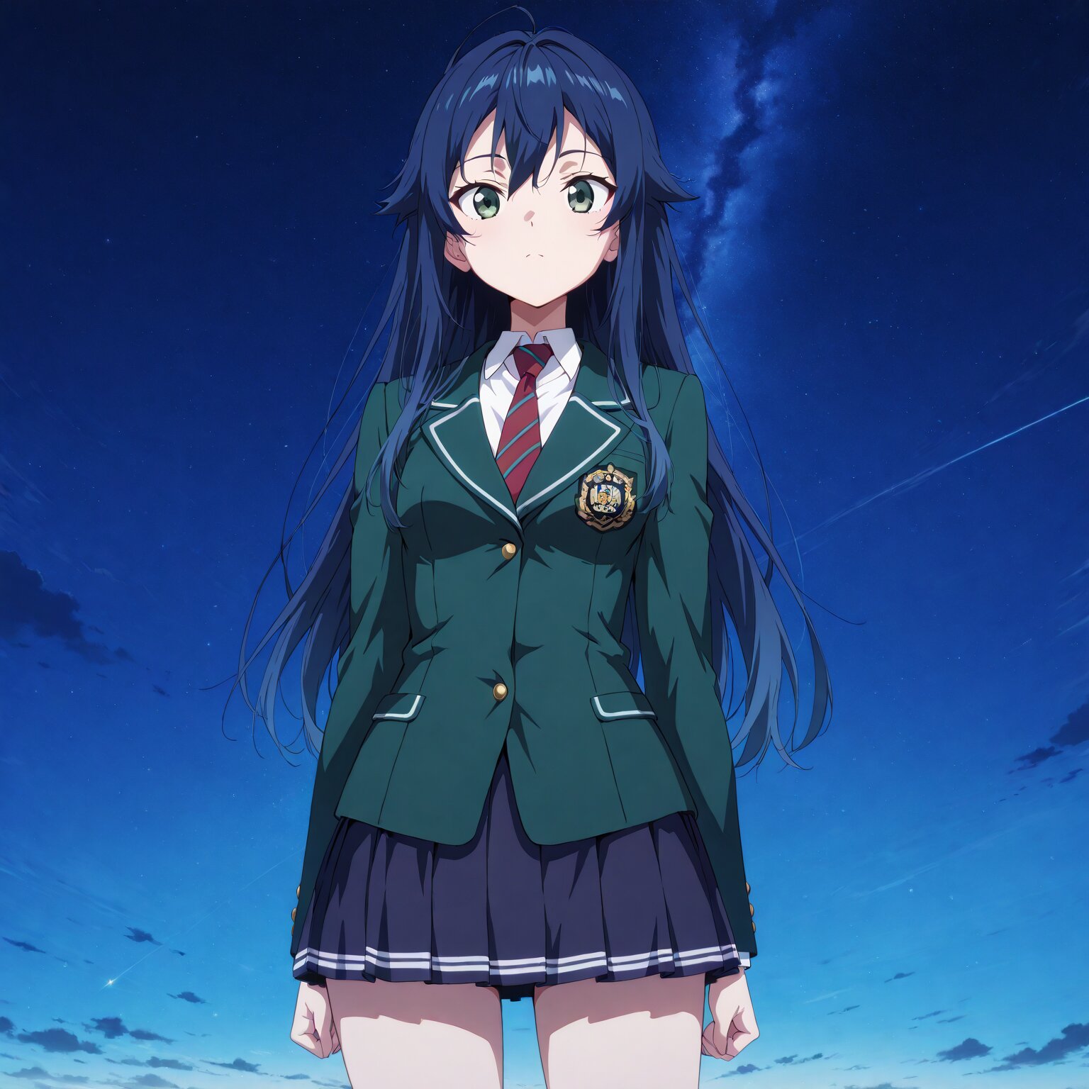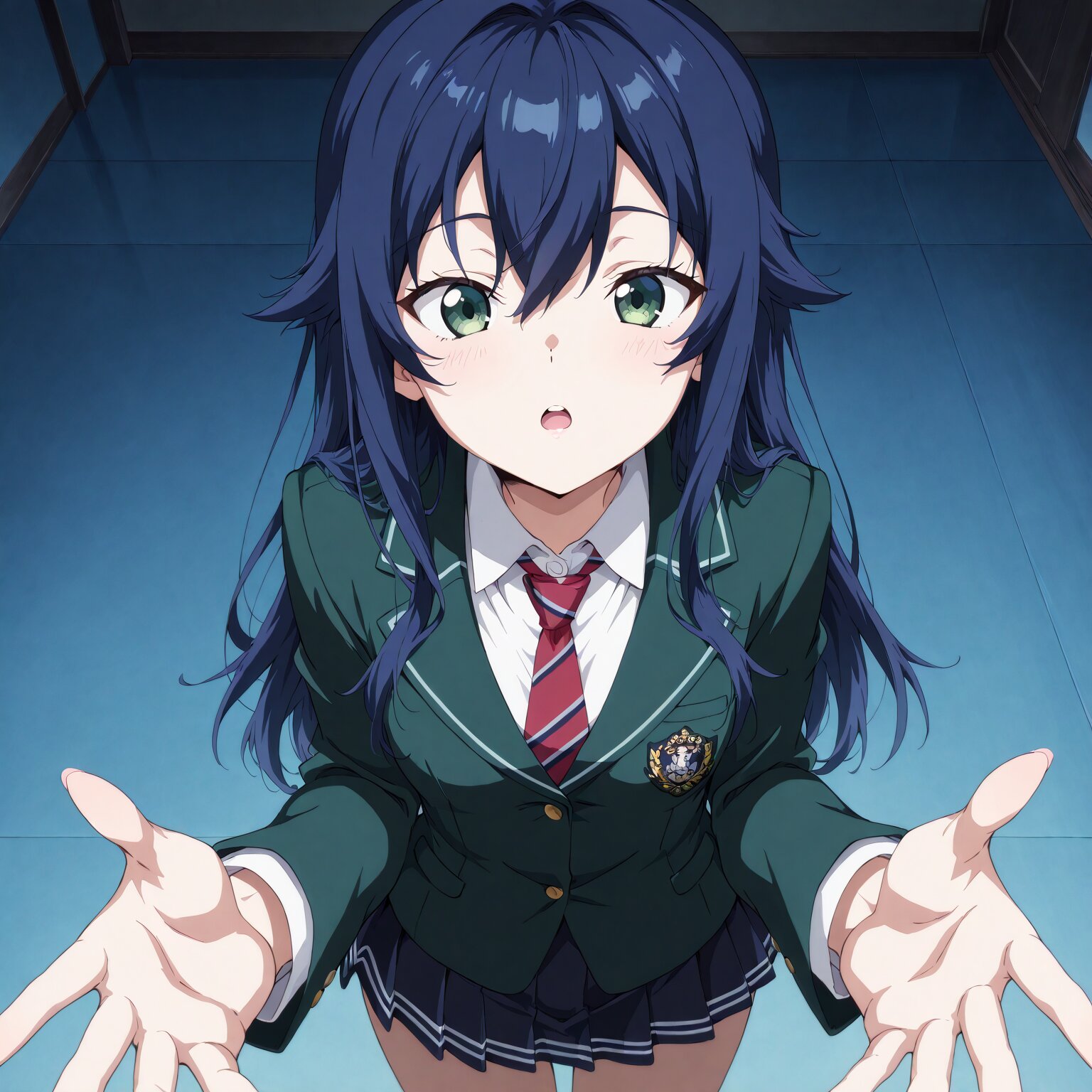 (1girl) dark navy blue hair, long hair, dark green eyes, small breasts, thin chest, School uniform, green blazer, dress shirt, tie Pleated skirts, mini skirts, BREAK, ((newest, anime, animation, anime screen capture, anime style:1.3)) BREAK, ((masterpiece, , vibrant, very aesthetic, highly detailed, best quality, 16k:1.3)) perfect fingers,