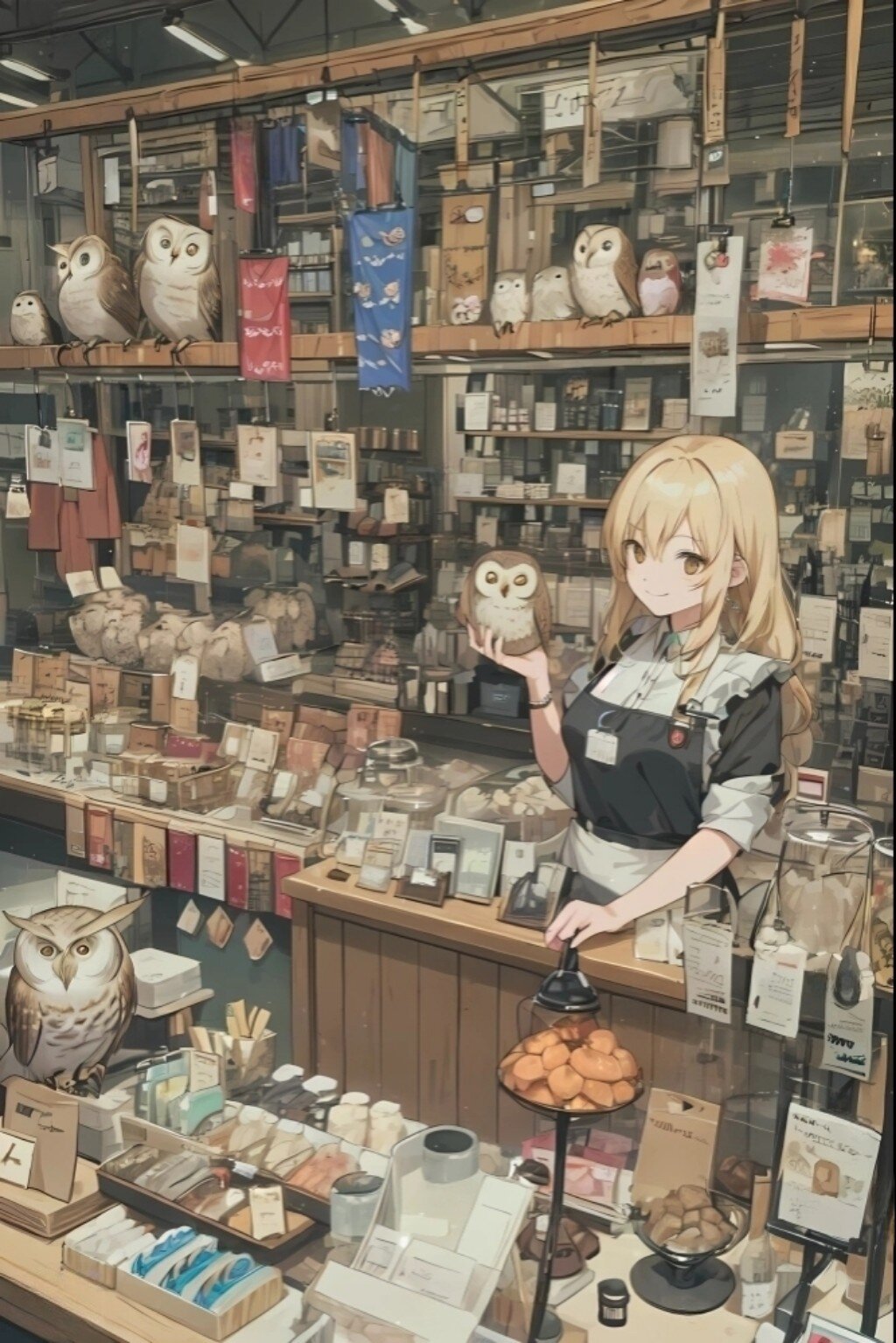 This is an owl specialty store, with owl accessories displayed throughout the store, and a blonde female clerk is smiling and waving at customers from across the counter. She is wearing a black apron dress and a name tag. Various owl goods and owl items are lined up on the counter, and even more shelves are visible in the back. The overall atmosphere is warm and friendly. Anime style.