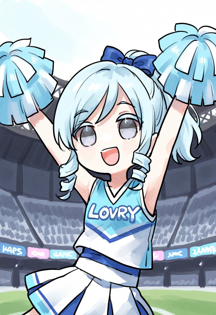 <lora:inmnstyleilxl:0.9>, best quality, masterpiece, very aesthetic, general, watercolor painting, 1girl, chibi, solo, lightblue cheerleader costume, _, ponytail, _, ivory colored hair, drill sidelocks, hair with paleturquoise tips, silver colored_eyes, _, holding pompom, arms up, stadium, smile, open mouth, dancing, jump
