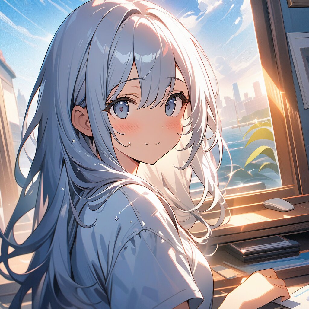 (masterpiece,high resolusion,illustration,ultra detailed 8k art,detailed shiny skin,perfect face,detailed background:1.3), ((highly detailed beautiful face and eyes)),1girl,beautiful silver hair,long hair,shiny hair,swept bangs,beautiful gradient silver eyes,droopy eyes,(droopy eyes:1.7)looking at viewer,smile,blue sky,sunlight,soft atmosphere,white blouse,