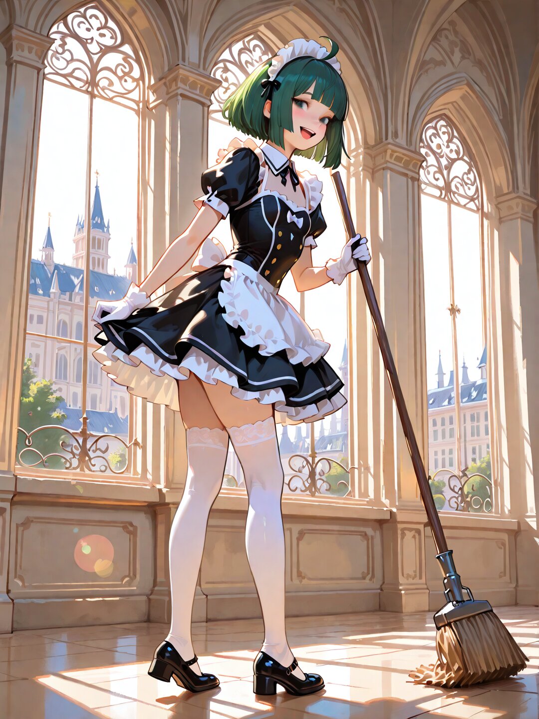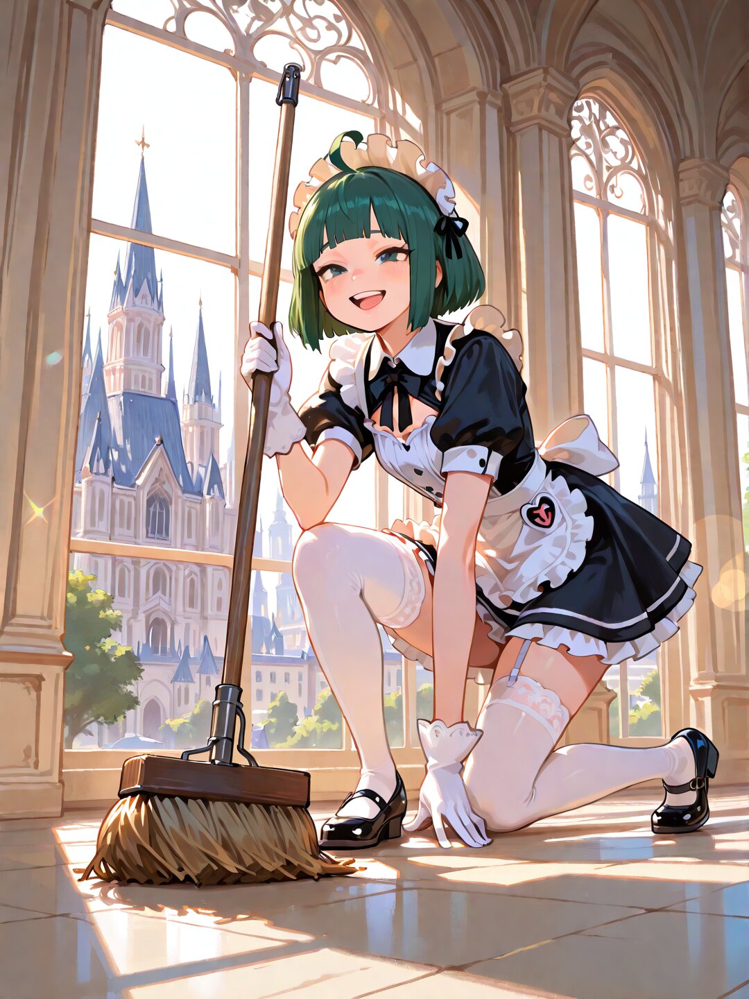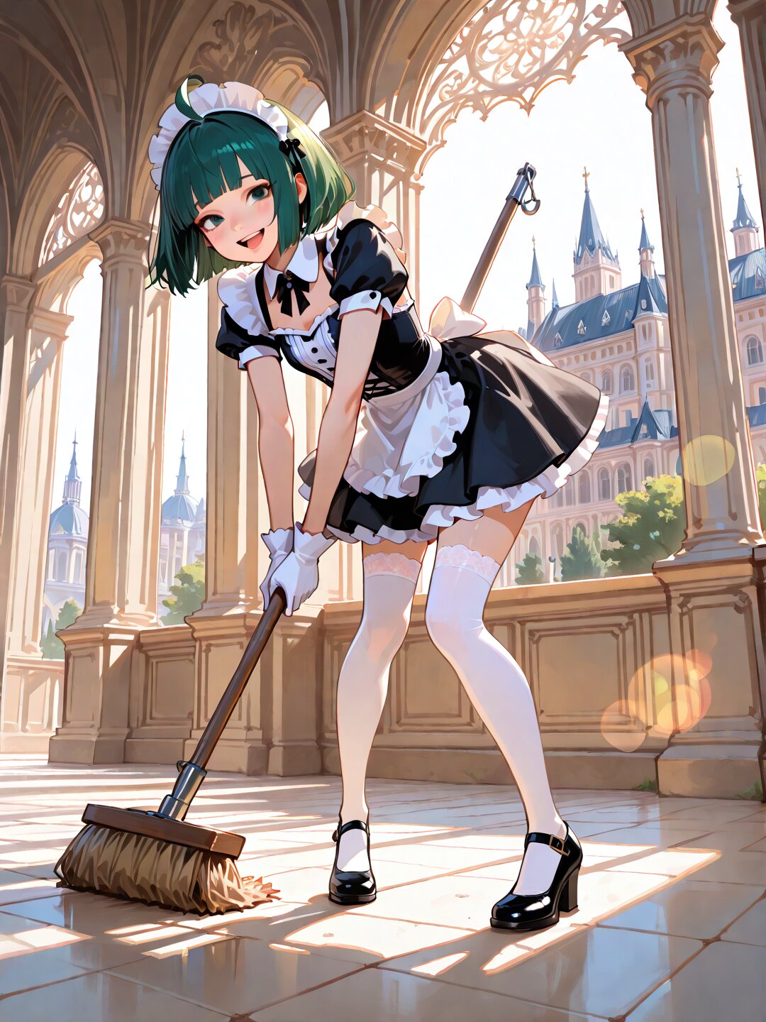 solo,1boy,cute,kawaii,ahoge,dark green eyes,green hair,hime cut,blunt bangs,straight hair,short hair, delicate face,detailed face,detailed skin,detailed hair,detailed hair,masterpiece,best quality,insanely detailed,beautiful,16k,realistic illustraiton,happy smile,open mouth,in large room,outside the window is a city,day time,cheerful,mini maid costume,frilled apron,frilled white brim,white gloves,white thighhighs,black maryjane shoes,flat chests,Sweeping the floor with a broom,maid,european,inside,palace,classic academia,gothic atmosphere,gothic architecture,lens flare,sunlight,bloom,soft lighting,