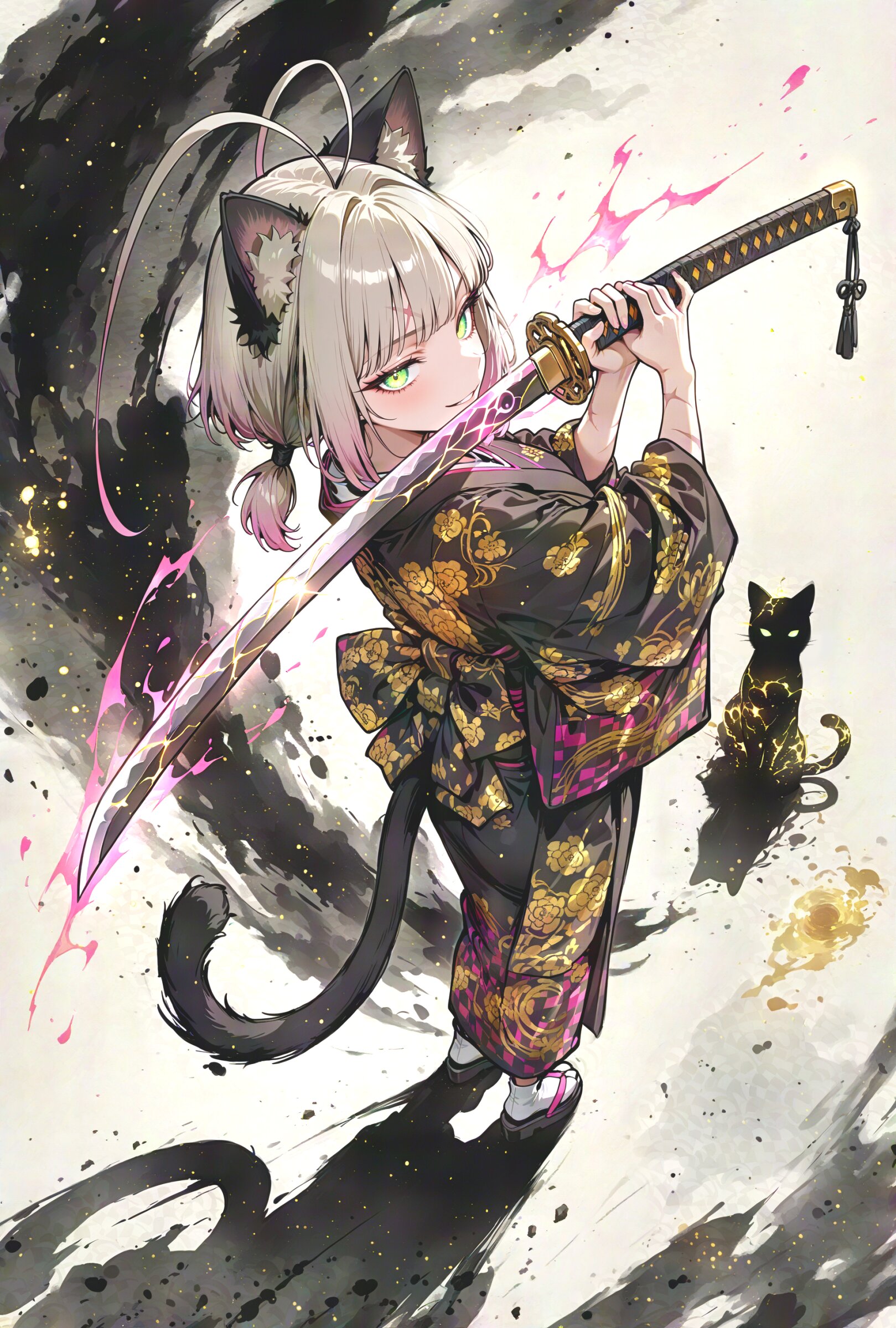 super fine concept art, hard surface, 8K, masterpiece, best quality, amazing quality, very aesthetic, absurdres, Over the Shoulder Shot, looking back, (very wide shot:1.0) (from above,looking up:1.0) looking at viewer, (dutch angle:1.2), The silhouette is composed of dynamic, plaid and vibrant oval. The background is a solid, creating a striking contrast with the intricate, multi-colored design of the character, summer atmosphere. glowing cat energy, platinum blonde silhouette of serious cat guardian, huge cat aura, 1girl, samurai, (muscular female:0.65), hotpink hair, light purple colored tips, short hair, low twintails,Bowl cut heart antenna hair lone nape hair, glowing eyes, eye trail, beautiful cobalt green eyes large breasts, scar on forehead, scar on arm, ,, (holding Japanese hotpink sword:1.3), scabbard, (checkered pattern kimono:1.0), kanzashi, seigaiha, sandals cat ears, cat tail, tabi, (seductive grin:1.0), seductive smile, broken weapon, torn clothes, wiping blood (swirling ink effects:1.2) fleeing, The background is a solid, bright platinum blonde, creating a striking contrast with the intricate, multi-colored design of the character, (dancing silhouette:1.0), pop color background, (high saturation:1.2), summer coloring, partly black ink wash effect, professional art lots of details, , overexposure, sumie effect style, 4ur4_illu,shiny, glowing, glowing particles, glowing light particles, light particles, platinum blonde shadow, <lora:noline (1):-0.5> <lora:sdxl2-flat2-512b:0.2> <lora:facelightup_xl_v10:0.5> <lora:V2_yakumo_alchemy:0.5> <lora:Aura_illu:0.1>