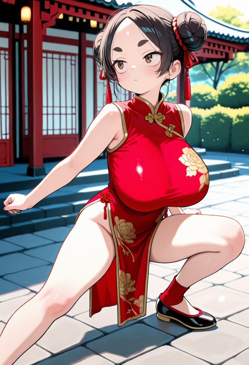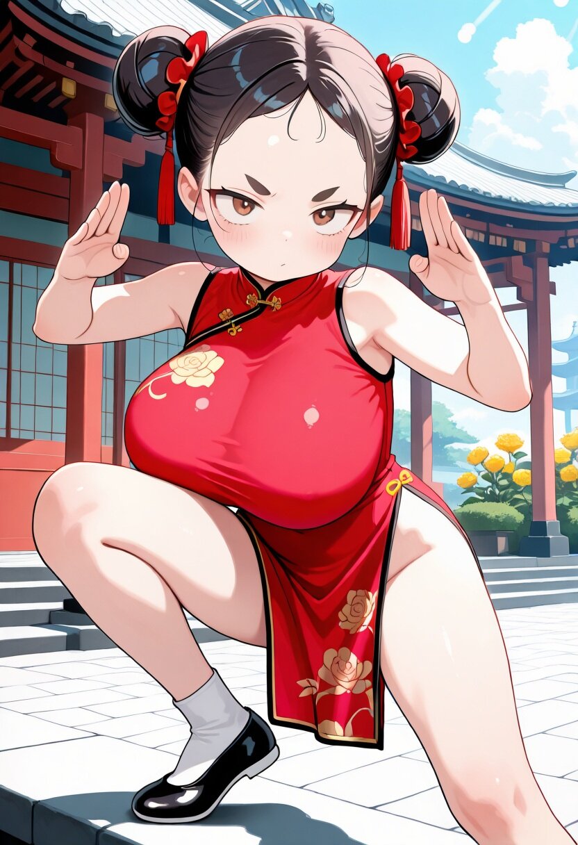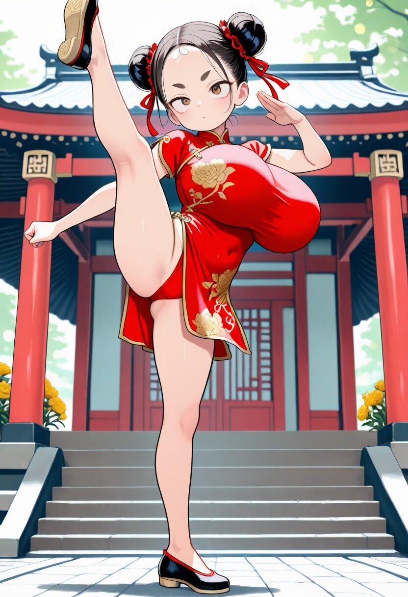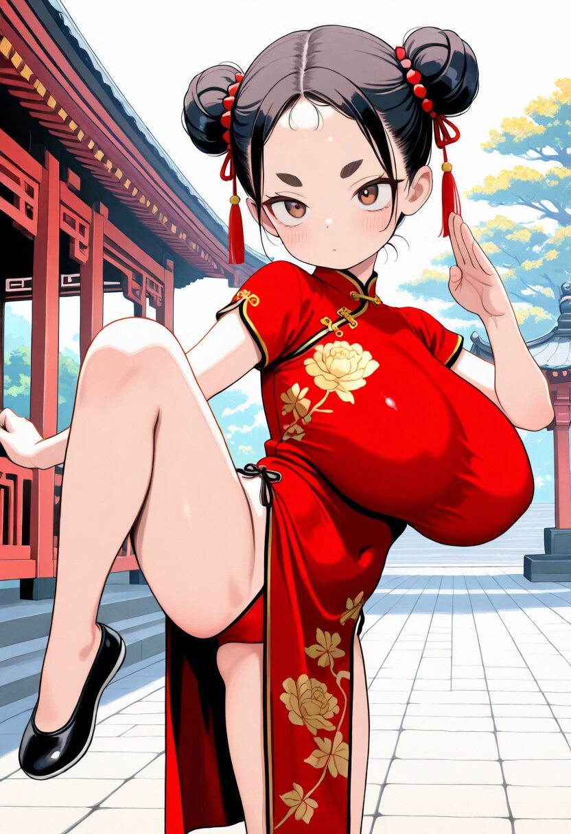 (masterpiece, best quality), ultra detailed,official art, delicate, flat color,anime screencap, adorable, newest, ((bokeh)),natural lighting, outdoors,chinese style temple, full body, BREAK 1girl, (female child, loli, petit:1.2),brown eyes, black hair,double bun,forehead,(huge breasts), standing, turime,sanpaku, thick eyebrows, fighting stance, standing on one leg,high kick, pink china dress,golden flower embroidery, high collar,kung fu shoes,side slit,