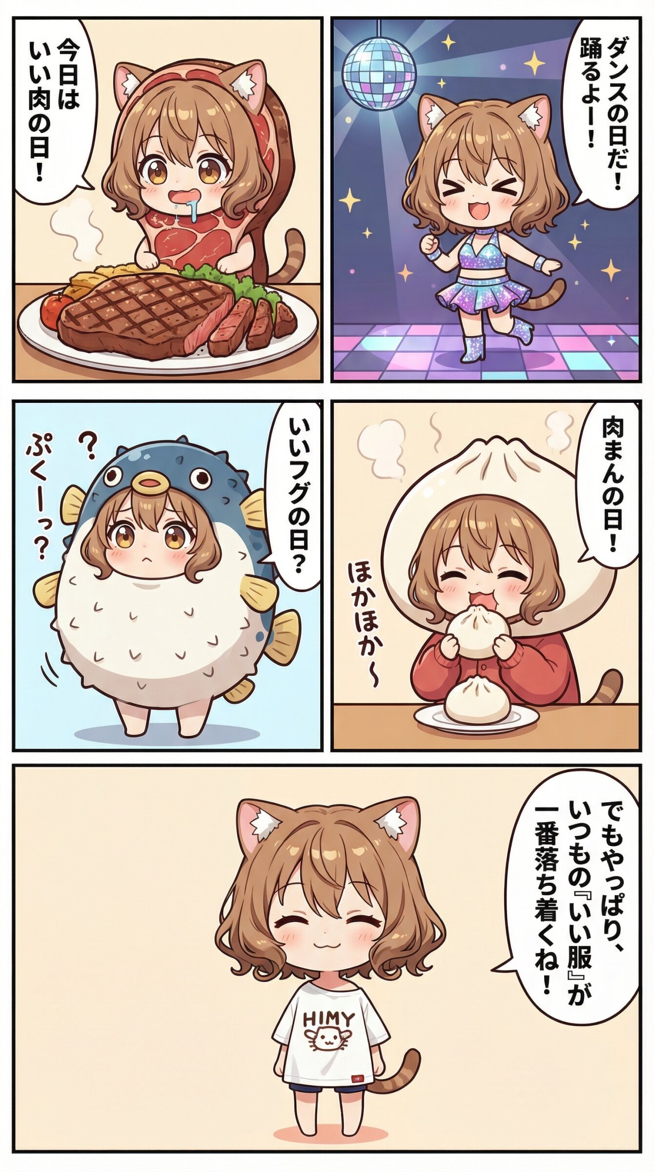 いい肉の日 ダンスの日 いいフグの日 肉まんの日 いい服の日 これらをネタに、この子が主役のユニークな短編漫画を作って。セリフはすべて日本語。服はネタに合うものに着替えさせて。