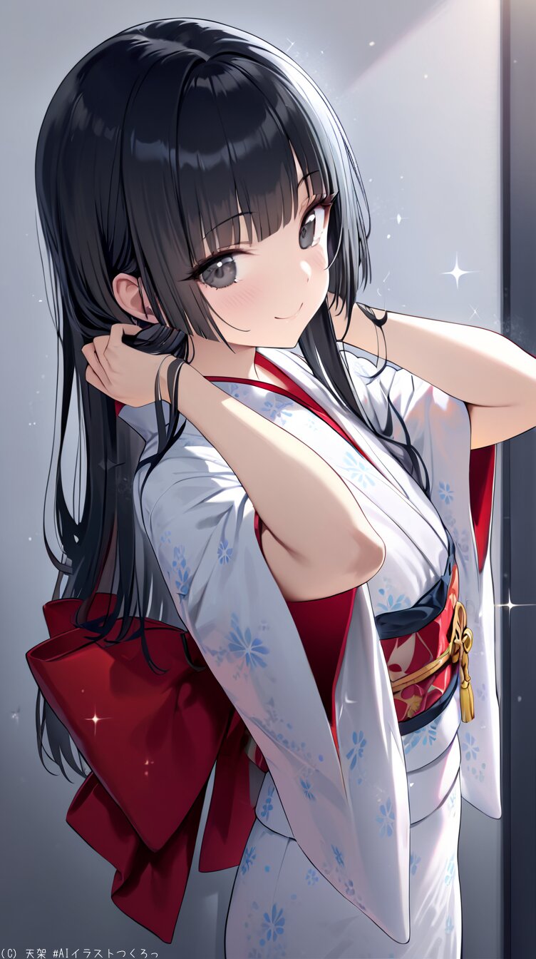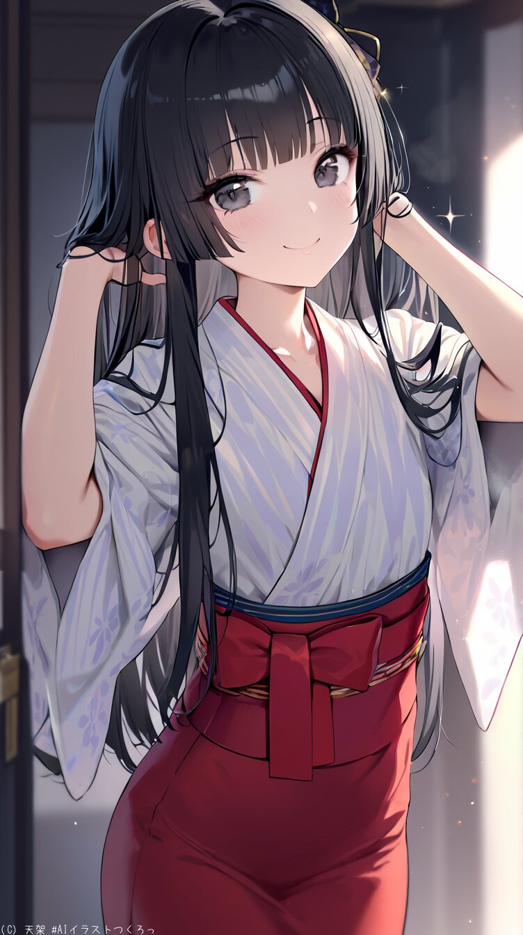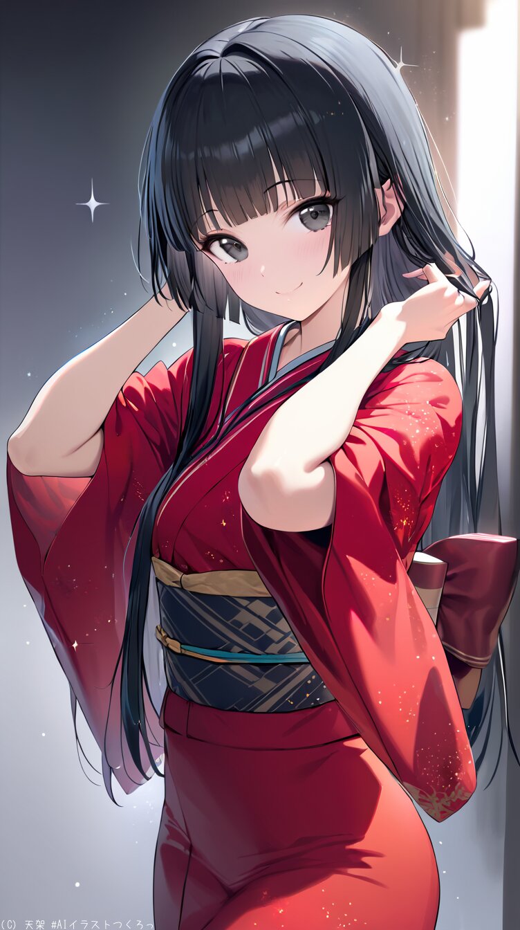 (best quality),(masterpiece),(ultra detailed), ,absurdres,hires,ultra detailed, high resolution hires, best quality, master piece, Cute 1Girl, 16years old, Smile, black hair, hime cut, long straight hair, black eyes, Slim body, hands in hair ,hair flip, Japanese clothes(red Furisode kimono ),shiny hair silky hair, sparkle (Effect),