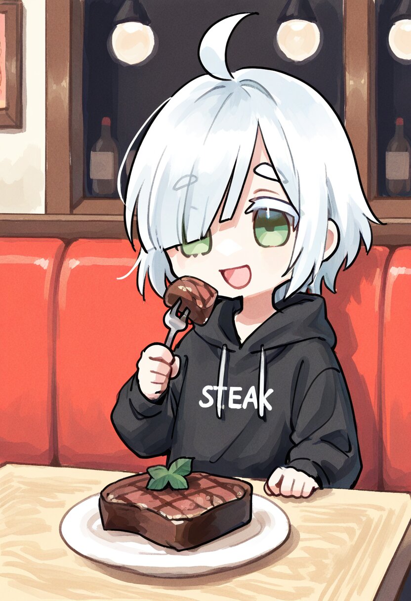 <lora:inmnstyleilxl:0.9>, best quality, masterpiece, very aesthetic, watercolor painting, general, 1girl, chibi, solo, (bright white hair), short hair, blunt bangs, white thick eyebrow, white colored eyelashes, (hair over one eye), ahoge, mint green eyes, oversize black hoodie, holding fork, steak, table, restaurant, smile, open mouth
