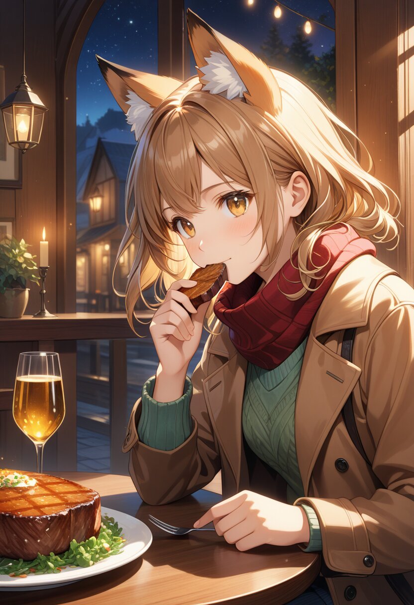 (high resolusion,illustration,ultra detailed 8k art,extremely detailed CG,official art,clothes reflecting light,detailed shiny skin,detailed background:1.3), ((highly detailed beautiful face and eyes),anime_style, fox_girl, fox_ears, light_brown_hair, double_eyelids, long_eyelashes, fluffy_tail, mini_skirt, tights, sweater, coat, boots, eating_steak, dining_scene, casual_pose, cheerful_expression, warm_color_palette, soft_lighting, cozy_atmosphere, expressive_eyes, detailed_background