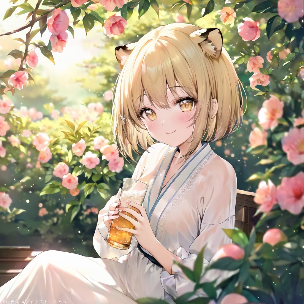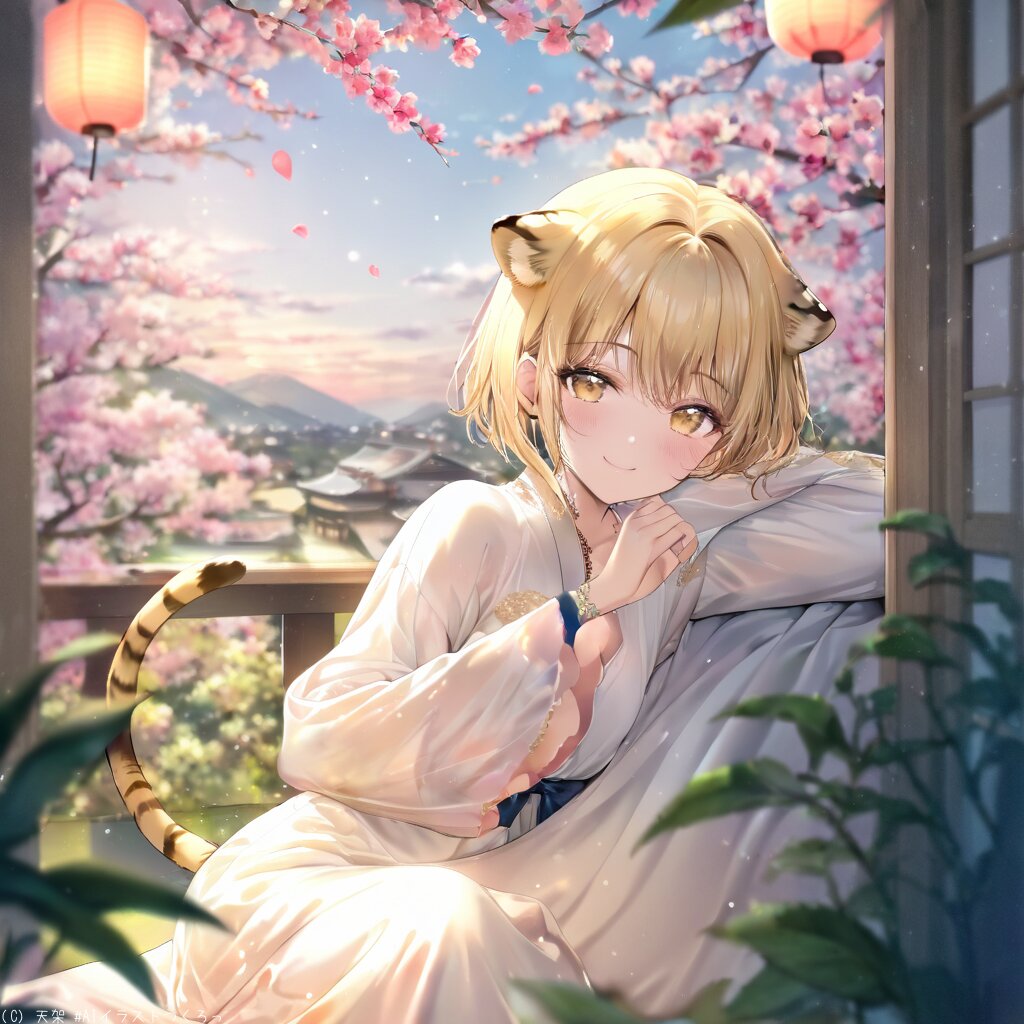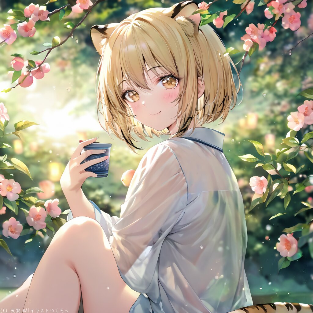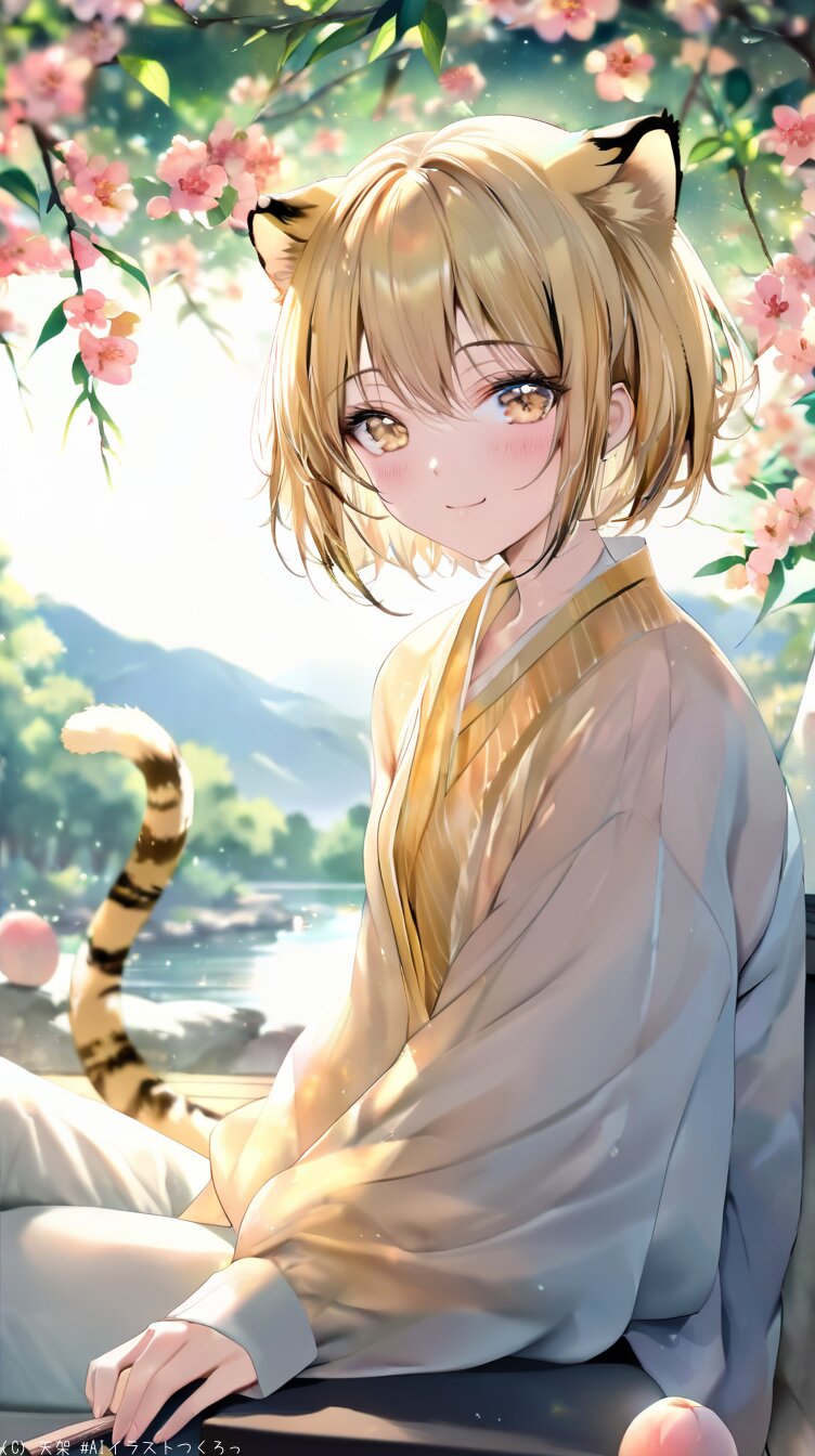 (best quality),(masterpiece),(ultra detailed),Water color Illust,absurdres,hires,ultra detailed, high resolution hires, best quality, master piece, Cute a tiger Girl, 16years old, Smile, Yellow hair,tiger tail , short straight hair, tiger eyes, tiger ears, Slim body , sitting peacefully under a (peach flower tree) , enjoying a lively drinking party. The scene captures a serene and joyful atmosphere, with lush green leaves, ripe peaches hanging from the branches, and traditional Japanese elements such as sake cups and lanterns. The girl has a gentle smile, wearing a casual yet elegant outfit, surrounded by a warm, inviting ambiance, holding a drink alcohol