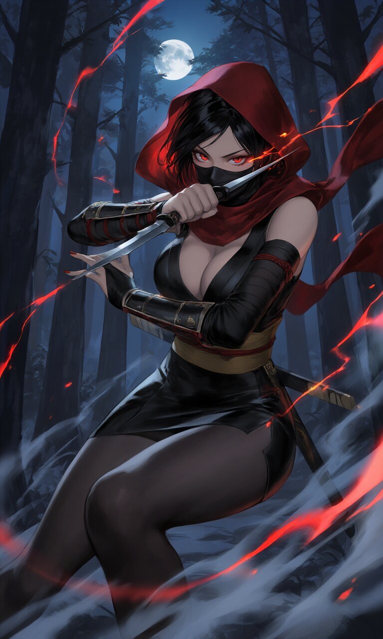 masterpiece, best quality, 1girl,mask,all the face,sharp eys,japanese sexy ninja,active pose,japanese sexy kunoichi,using black,red,only,fighting pose,red burnig eye,red ninja hood,japanese forest background,dark night,black tights,mini skirt,ninja weapon,