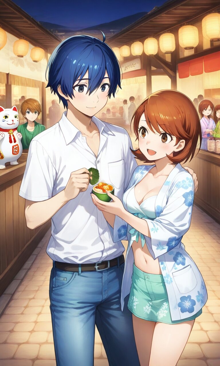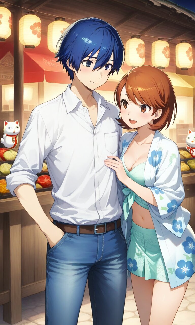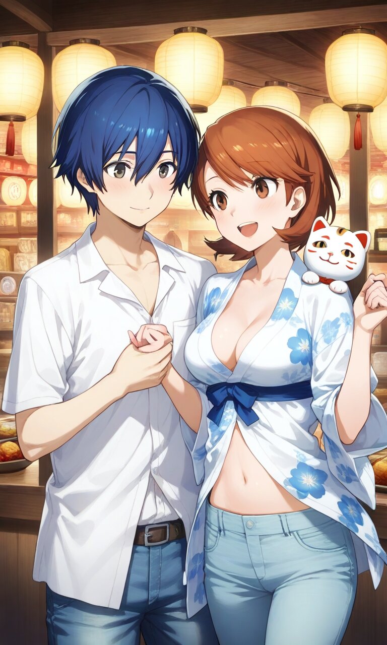 Couple, boy and girl, two people only,absurdres, ultra-detailed, master piece, high resolution, 8k, Boy, girl, couple, masterpiece, best quality, extremely detailed, beautiful detailed woman , light summer yukata with floral pattern, holding small white maneki-neko, excited smile, boyfriend in casual shirt and jeans paying at wooden stall, colorful evening shopping street with lanterns and food stalls, warm lighting, perfect anatomy BREAK the boy(yuuki makoto, blue hair, gray eyes, 1 boy , ) BREAK the girl(yukari takeba, short hair, light brown hair, brown eyes, large breaths,Cleavage, navel)