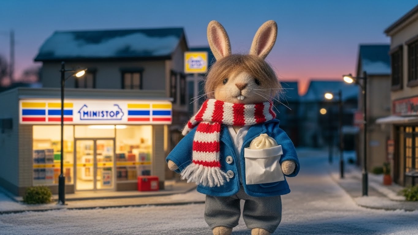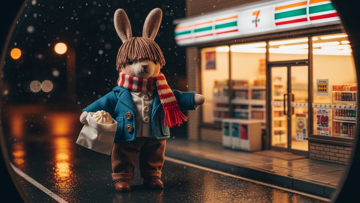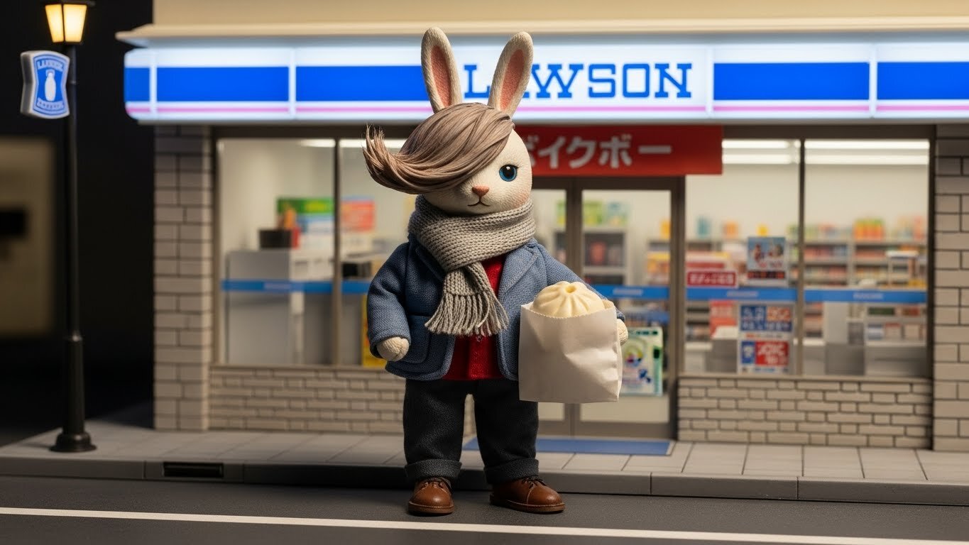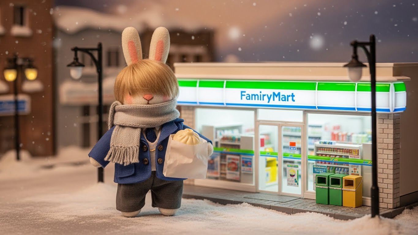 figure vignett diorama stuffed-rabbit blazer pants winter-scarf hair-over-eyes steamed-bun in white-paper-bag Convenience store "awson" town street