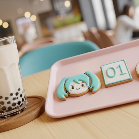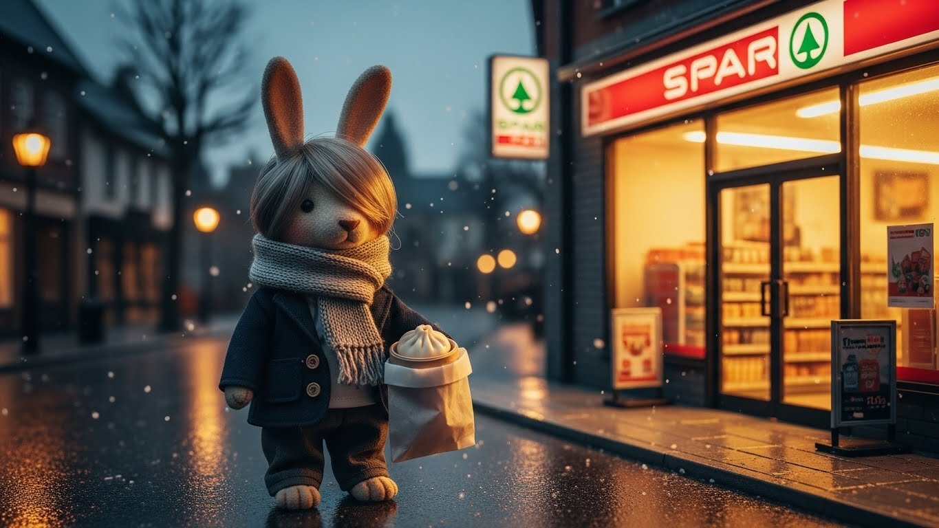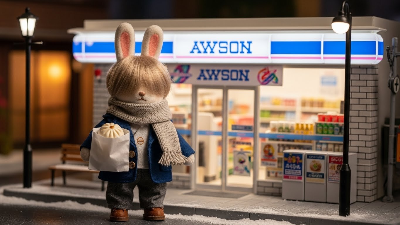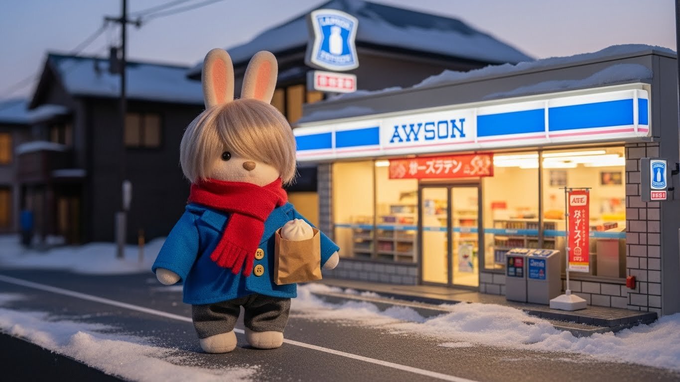 figure vignett diorama stuffed-rabbit blazer pants winter-scarf hair-over-eyes steamed-bun in white-paper-bag Convenience store "awson" town street