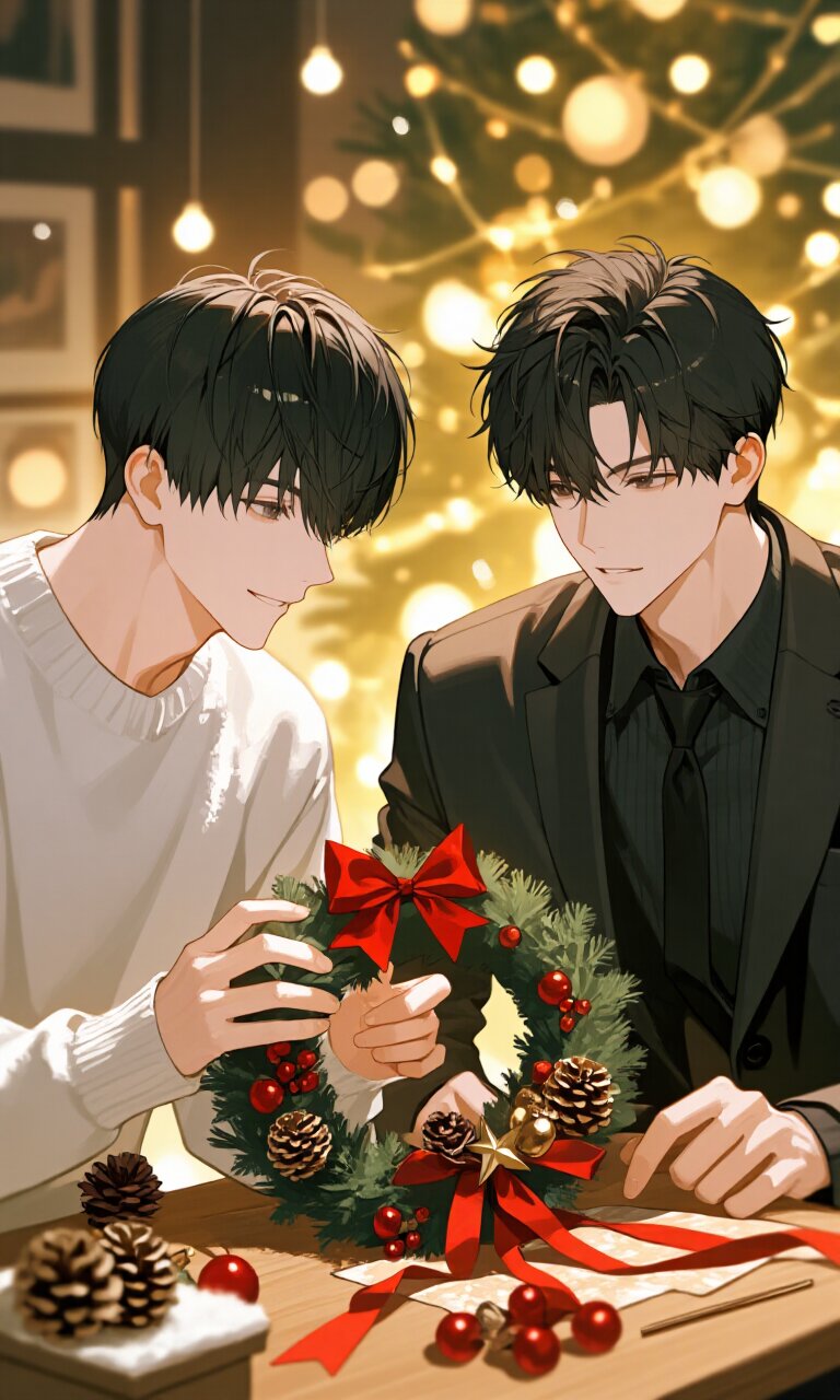 cozy handmade Christmas wreath workshop, warm wooden table, soft golden lights, beautiful two men creating a wreath with red berries, pinecones, evergreen, ribbon, delicate hands, gentle smile, fluffy sweater, natural warm color palette, bokeh lights, detailed textures, romantic Christmas mood, anime style, ultra detail one is:delicate and elegant young Japanese man, short soft black hair parted slightly to the side, pale skin, calm and thoughtful expression, wearing transparent white shirt, slim-fit dark slacks, no tie, minimal accessories, modern and slightly casual but refined look, standing straight, full body, front-facing pose, plain white background, soft shadow, anime style, high detail, clean line art one is:A young Japanese man. His dark, slightly tousled hair is swept back from his forehead, with a few strands falling across his face. His pale brown eyes carry a faintly melancholic expression. He wears a black suit with a tie in a similar shade, paired with black slacks and leather shoes. The background is a clean, bright solid white, making the subject stand out. The lighting is soft and diffused, creating a slightly somber atmosphere. The artistic style features clean, sharp lines, with meticulous attention to detail in facial features and the shading of clothing. An overall mood of quiet emotion and introspection permeates the image.