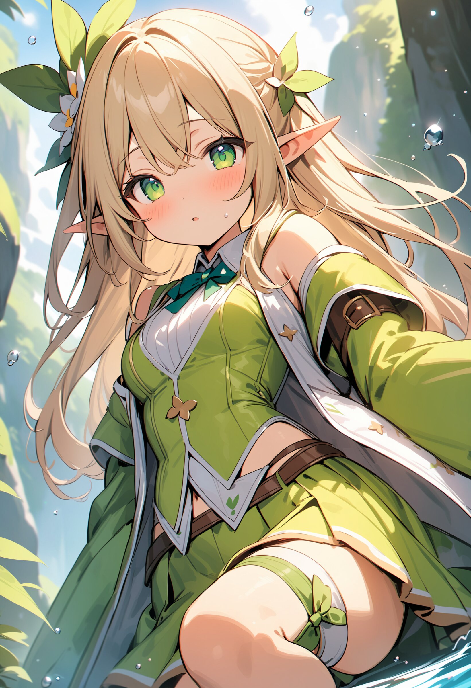 ((masterpiece)), ((best quality)), ((kawaii)), cute, (lovely), ((extremely detailed)), (beautiful), dynamic angle, a cute girl, 1girl, solo, ((elf )),beautiful blond hair, beautiful green eyes, ((beautiful eyes)), long hair, fantasy clothes,