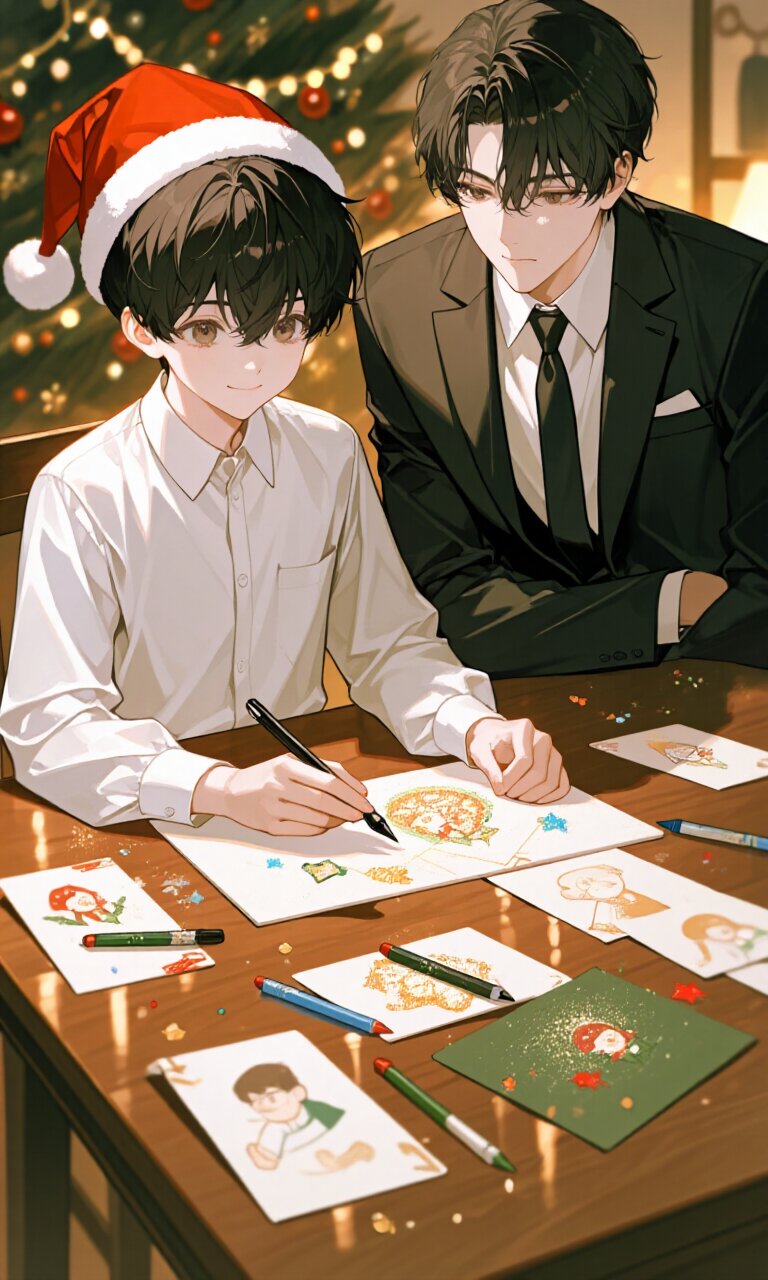 cute boy and man wearing a santa hat, drawing christmas cards at a desk, colorful pens, glitter powder, tiny stickers, soft glowing lights, innocent smile, warm cozy room, anime style, crisp details, festive mood boy is:delicate and elegant young Japanese man, short soft black hair parted slightly to the side, pale skin, calm and thoughtful expression, wearing transport white shirt, slim-fit dark slacks, no tie, minimal accessories, modern and slightly casual but refined look, standing straight, full body, front-facing pose, plain white background, soft shadow, anime style, high detail, clean line art one is:A young Japanese man. His dark, slightly tousled hair is swept back from his forehead, with a few strands falling across his face. His pale brown eyes carry a faintly melancholic expression. He wears a black suit with a tie in a similar shade, paired with black slacks and leather shoes. bright solid white, making the subject stand out. The lighting is soft and diffused, creating a slightly somber atmosphere. The artistic style features clean, sharp lines, with meticulous attention to detail in facial features and the shading of clothing. An overall mood of quiet emotion and introspection permeates the image.