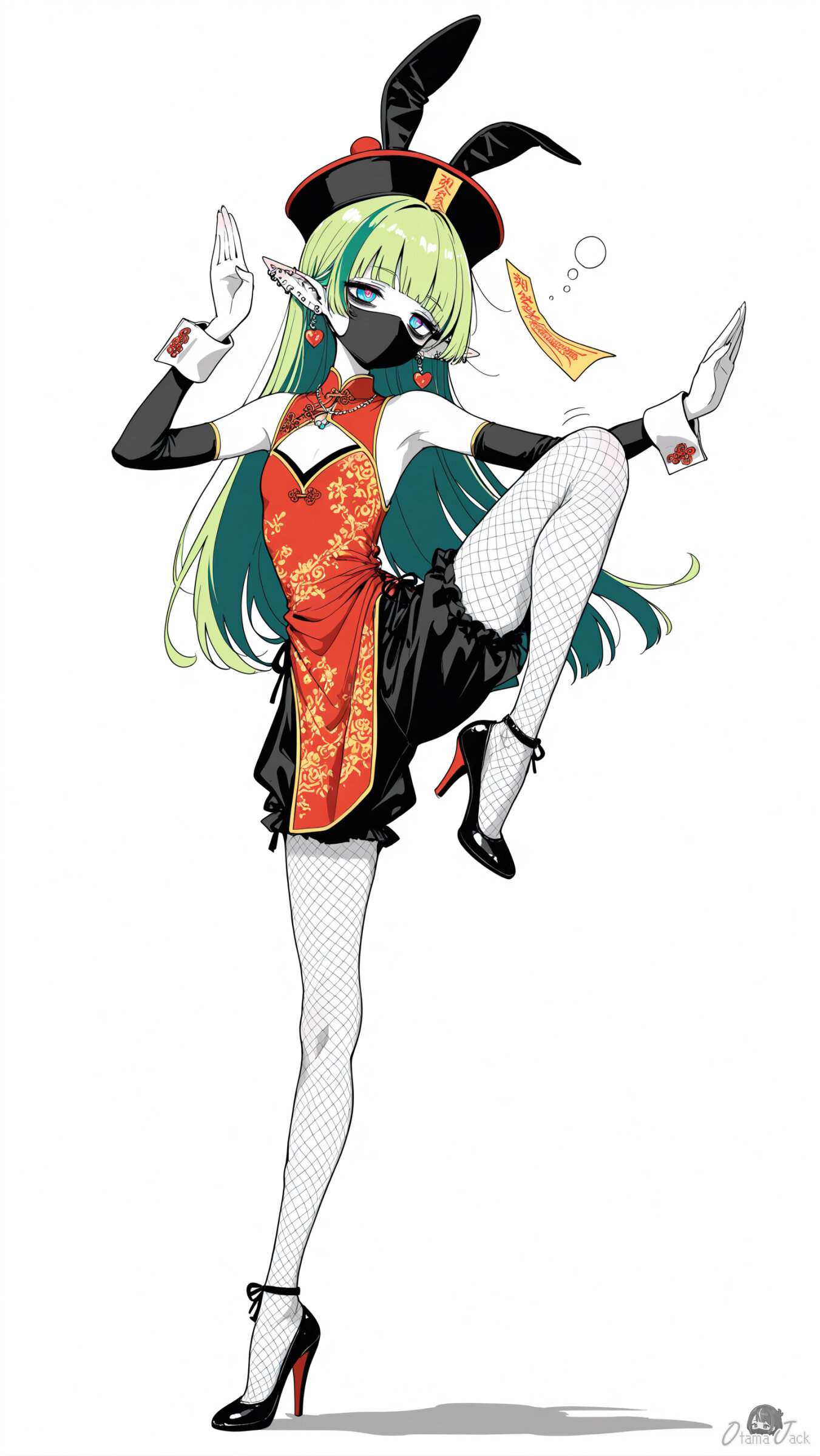 jiangshi bunny girl, bunny suit with chinese elements, sleeveless qipao style bunny outfit, talisman on forehead, bunny ears with chinese design, detached sleeves, thigh-high fishnet stockings, high heels, red and gold color scheme, glowing eyes, undead theme, ancient chinese hat, ornate embroidery, spooky cute, stylish undead,Pale skin, Action pose,