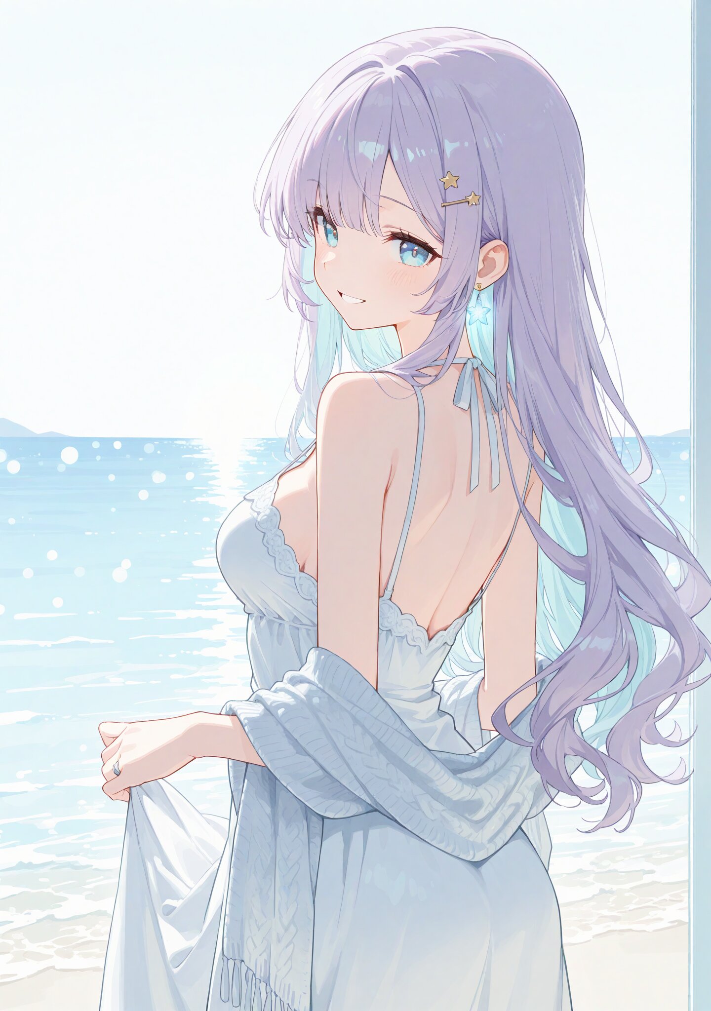 winter seaside backlight scene, sun outside the frame, strong directional light from behind, a girl shown clearly from behind, wearing a pure white winter dress with modest coverage, a soft shawl draped over her shoulders, the shawl gently lifted by the cold breeze, hair illuminated by strong backlight with translucent glowing strands, light softly passing through the hair edges, warm scattering light around individual strands, no halo, no circular glow, no ring of light, elegant silhouette facing the ocean, shimmering winter waves, cool muted pastel tones, natural rim light only, serene mature atmosphere, minimal skin exposure suitable for winter, masterpiece, best quality, soft pastel color palette, thin delicate lineart, pale colors, watercolor texture, matte finish, subtle shading, minimal contrast,, (masterpiece:1.3), (best quality:1.2), dreamy pastel bokeh, soft rim light, crisp anime lineart, soft cell shading, high detail, elegant atmosphere, soft anime face, teenage, pastel purple hair, (light blue inner hair:1.3), fluffy long hair, loosely wavy hair, soft flowing hair, straight-cut bangs, star-shaped hairpin, calm violet eyes, medium breasts,, (a big smile:1.2)