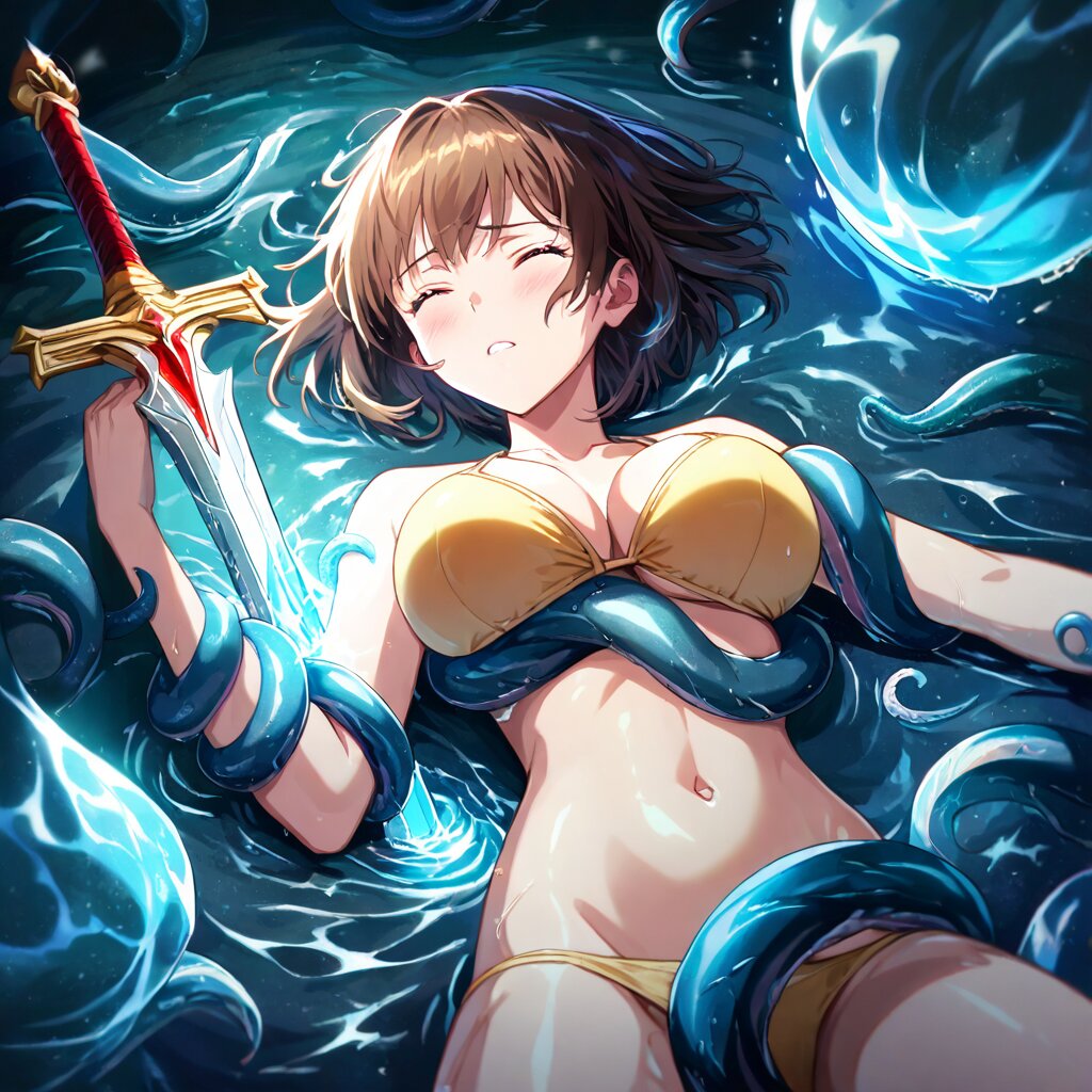 ((masterpiece)), ((best quality)), (ultra-detailed), anime style,cowboy shot, a mystical cave with glowing water,underground,surrounded by monsters, a cute girl, (yellow bikini),Tentacles entangled her body,large bust, beautiful brown hair, beautiful red eyes, ((beautiful eyes)), ((short hair)), Holding a weapon in hand, gripping Sword, ((lying on back)) ,(((closed eyes))) , ((death)),(Her body wet with mucus),Defeat scene,(screaming)