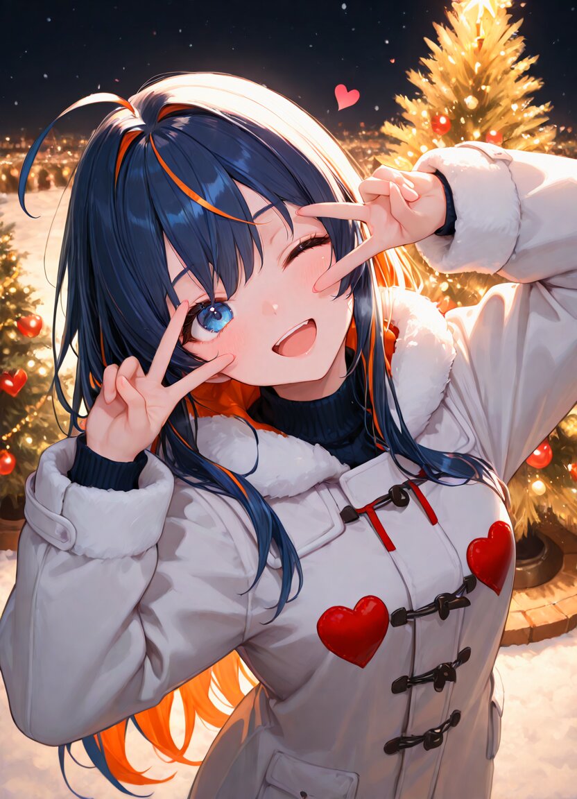general, simple background,at night,at winter,christmas tree, many hearts on background, 1girl,solo,standing,one eye closed,smile,open mouth,head tilt,v over eyes, deep blue hair,long hair,ahoge,orange streaked hair,blue eyes,orange inner hair, winter clothes, upper body,from above,, appropriate posture,appropriate configuration,ideal ratio body proportions,perfect anatomy, <lora:Fixhands_anime_bdsqlsz_V1:1>, masterpiece,best quality,newest,absurdres,highres,ultra high res,8K UHD,hyper-detailed,