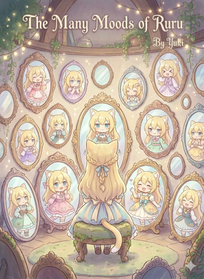 座っている猫耳娘の後ろ姿、雰囲気に合う服を着て、たくさんの鏡に囲まれている、それぞれの鏡に色んな表情や服装でうつっている、気まぐれな猫のように、絵本風のタッチ、絵本の表紙のようなデザイン、ふさわしいタイトルをふさわしいフォントで。「By Yuki」を雰囲気を合わせて小さめに。
