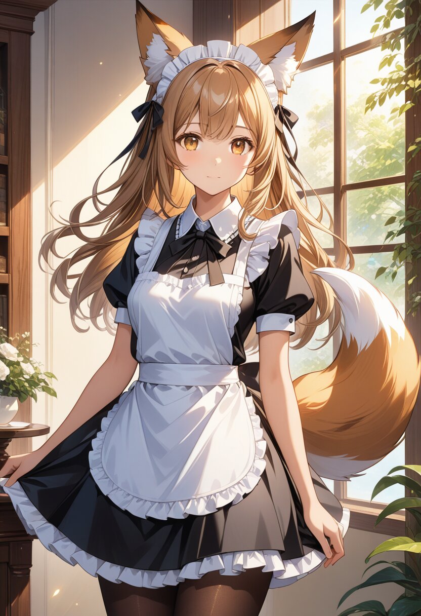 (high resolusion,illustration,ultra detailed 8k art,extremely detailed CG,official art,clothes reflecting light,detailed shiny skin,detailed background:1.3), ((highly detailed beautiful face and eyes),anime_style, fox_girl, fox_ears, light_brown_hair, double_eyelids, long_eyelashes, fluffy_tail, mini_skirt, tights, housemaid_outfit, apron, lace_details, delicate_features, expressive_eyes, soft_lighting, warm_color_palette, elegant_pose, cozy_atmosphere, detailed_clothing, charming_scene