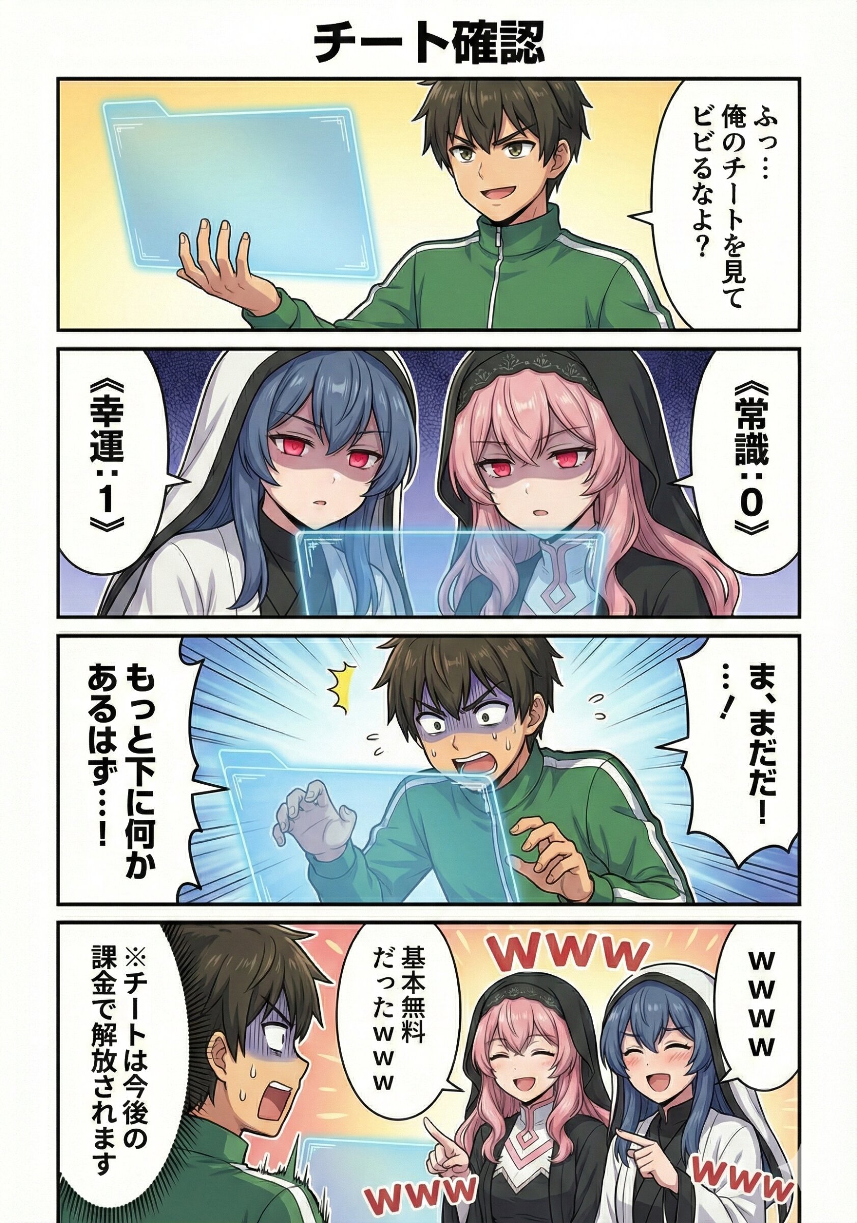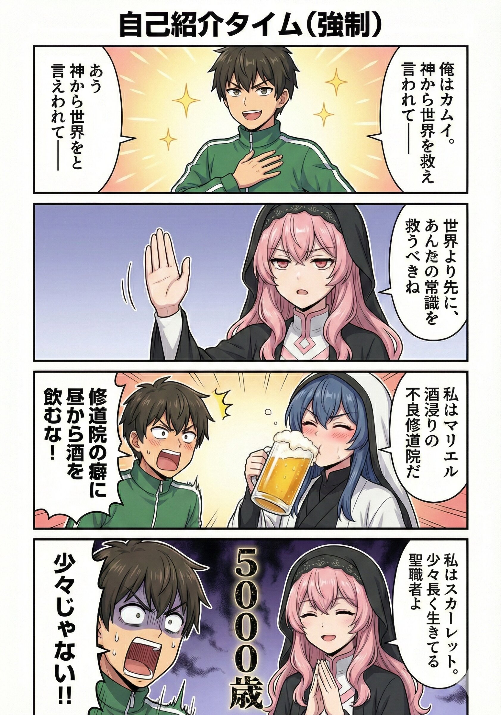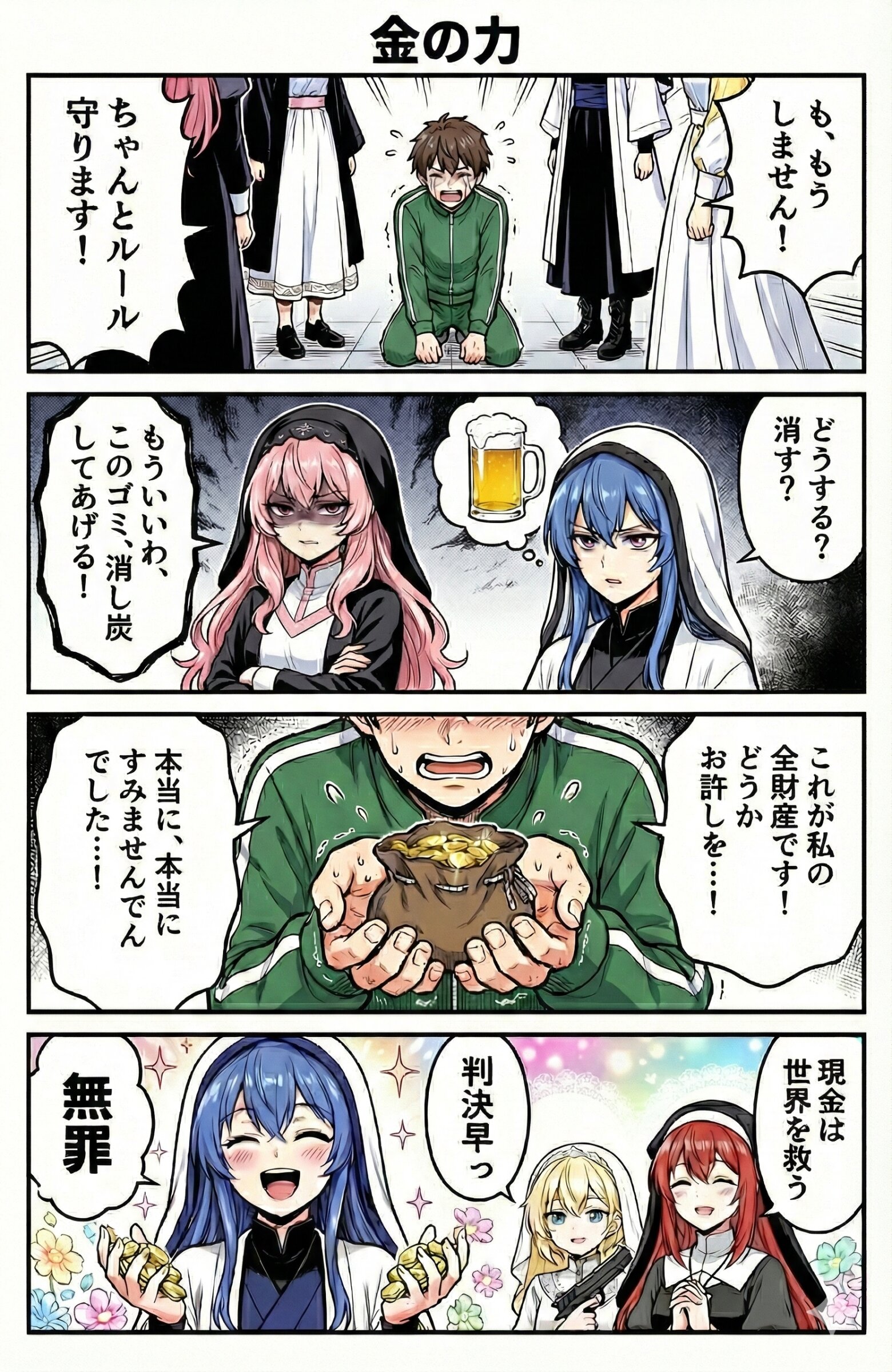 シスター達の4コママンガ➀ 華燦風鈴 2025/11/30使用したAI Gemini/Nano Banana 年齢制限 全年齢 いいね7 シェア #まともじゃないシスター #ベール #4コママンガ まともじゃないシスター達の4コママンガ第1弾毎週火、金、日の週3ペースで10本4コママンガ制作する予定です プロンプト なし コメント 送信 華燦風鈴 2023年11月より活動開始 126投稿42フォロー44フォロワー よろ フォローする 他の作品 全てを見る まともじゃない修道院のキャラシート 殺意の修道院 おは動画 4人の修道院 メイド喫茶でバイト 読書 派手な服 おはイラスト3日目 感謝のイラスト 変態の理想 おはイラスト3日目 おはイラスト2日目 おはイラスト1日目 ごちゃ混ぜファッション 「太陽の化身八咫烏、誕辰の饗宴」 感情なき少女➀ 「Empress of Eternal Dusk 〜宵闇に潜む魔姫〜」 八咫烏と風呂 もっと見る