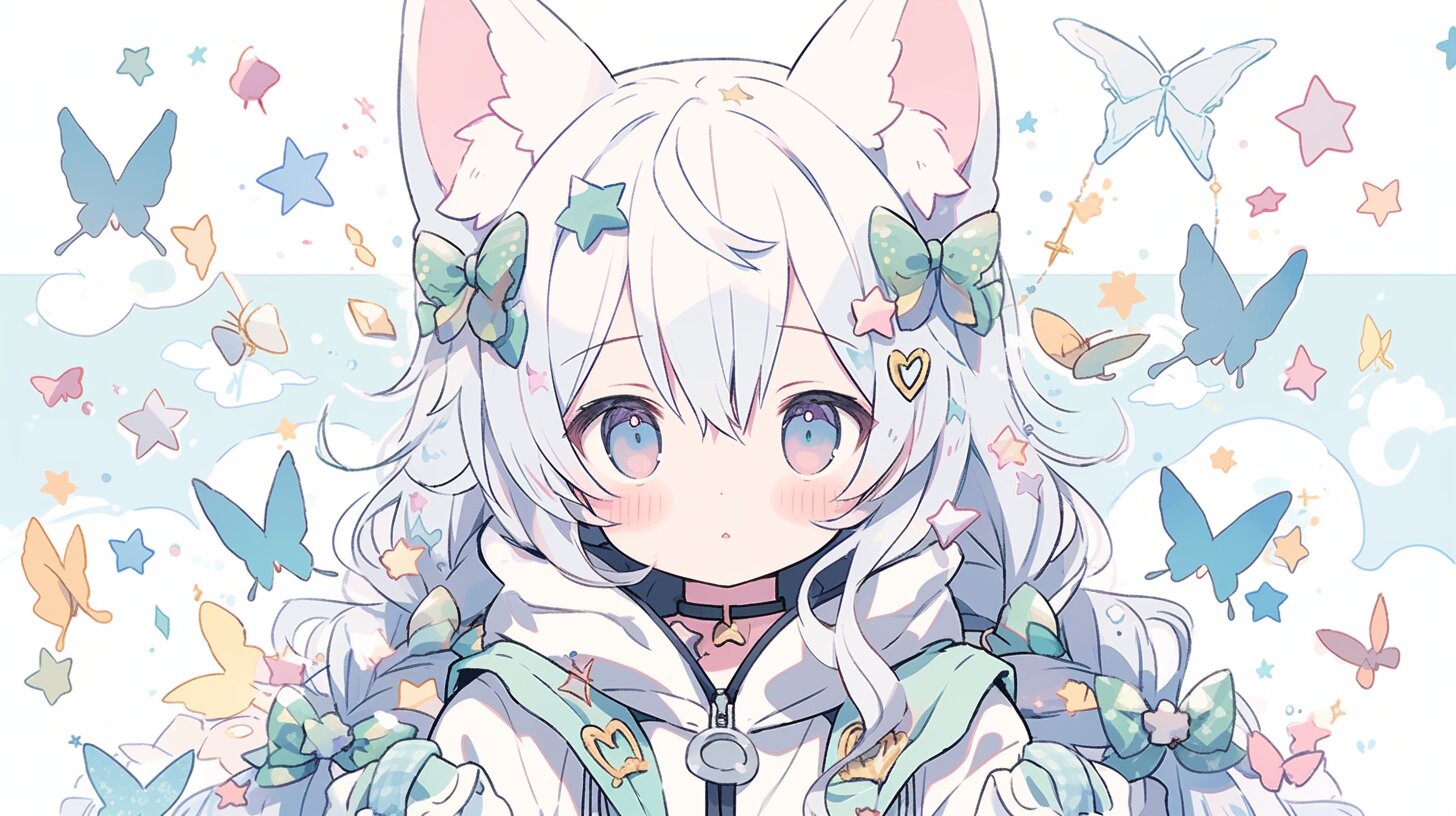 夢幻の森に住む白い髪の少女は、星のような飾りを纏い、色とりどりの蝶たちと戯れる。彼女の青い瞳には、遠い記憶が宿り、穏やかな風が吹く中、秘密の冒険が始まる。蝶の翼が光を散らし、少女の日常は魔法の瞬間で満ちている。もしかすると、彼女は失われた星の守護者なのか? 森の奥で繰り広げられる不思議な物語に、君も誘われてみないか。