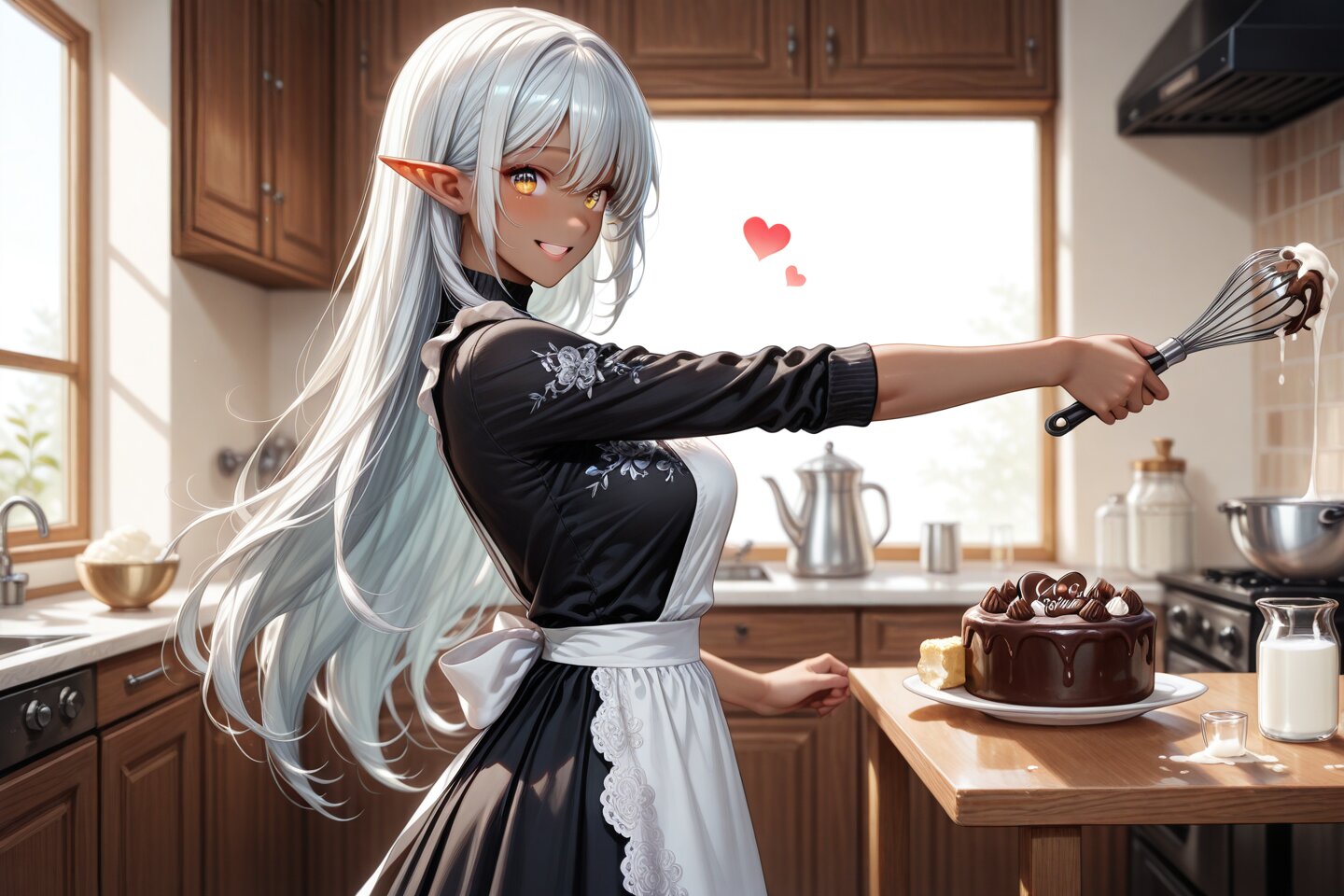 background is delicious, yummy field, fine detail, official art, modern system kitchen in house. 1girl, reaching, (Table in use: bowl, sponge-cake, milk, chocolate, whisk). holding a b�che de No�l on plate with heart effect. turtleneck, long-skirt white apron, covered shoulders, heart effect around her, Intricate embroidery and decoration, cowboy shot, happy smile, gaze at viewer, ultra detailed lips, ultra detailed face and hair, ultra detaild eyes, beautiful eyes, she is Elegant, Graceful. dark elf woman, golden eyes, Moist eyes, (dark skin:1.4), dark-skinned female:1.4, (shine silver hair:1.3),indoors, from side, masterpiece, amazing quality, very aesthetic, high resolution, ultra-detailed, absolute, newest, 2d, semi-realistic, moe heroine, sharp focus,, <lora:elf-san_alpha1(AnimagineV31):0.7> <lora:elf-san_alpha4(IL1.0):0.7>, anime style, anime color,