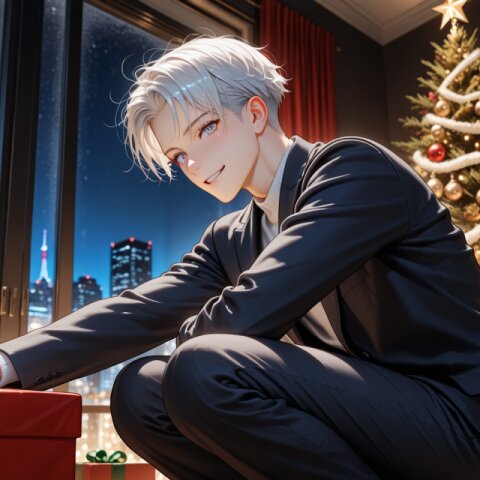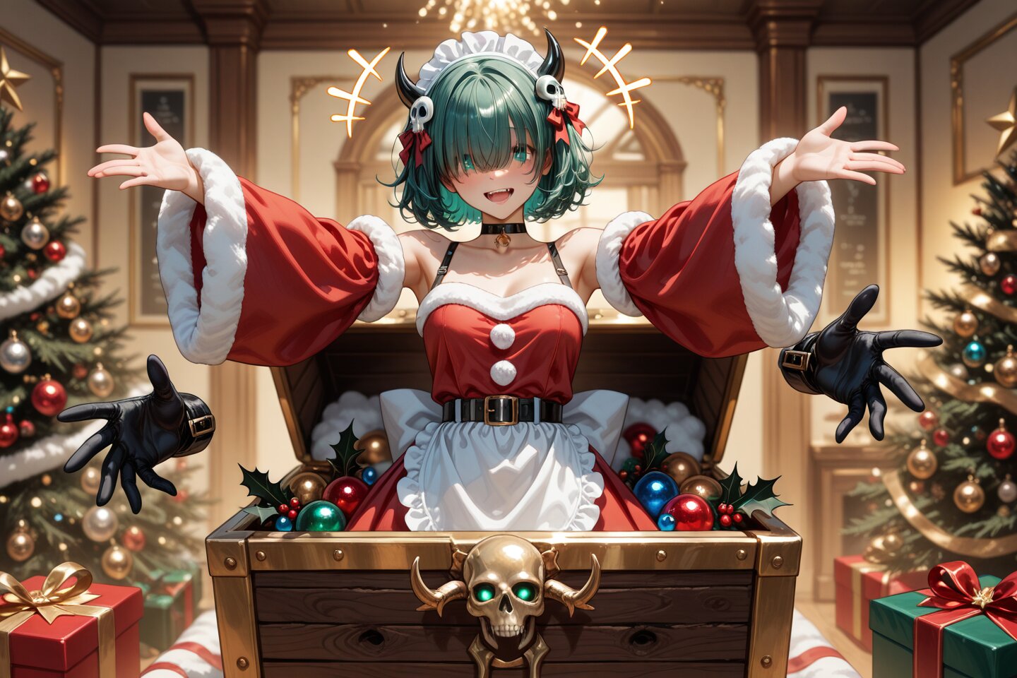 cobalt green hair, short hair, messy hair, (hair over eyes:1.2), green eyes, demon fangs, +_+, open mouch, smile, cheerful, +++, notice lines, choker, Santa Claus costume style maid outfit, (oversized sleeves:1.2), detached sleeves, (floating black ghosty hands:1.2), skull hair ornament, in mimic chest, break, (A bar decorated for Christmas), decorated Christmas tree. cowboy shot, gaze at viewer, ultra detailed lips, ultra detailed face and hair, ultra detaild eyes, beautiful eyes, A kawaii, adorable, cute, indoors, lot of Christmas ornament. from the front, spread arms., masterpiece, amazing quality, very aesthetic, high resolution, ultra-detailed, absolute, newest, 2d, semi-realistic, moe heroine, sharp focus,, <lora:elf-san_alpha1(AnimagineV31):0.7> <lora:elf-san_alpha4(IL1.0):0.7>, anime style, anime color,