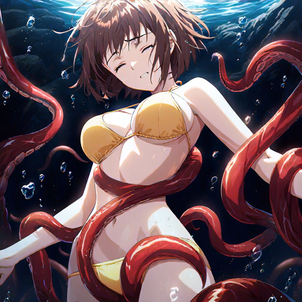 ((masterpiece)), ((best quality)), (ultra-detailed), anime style,cowboy shot, dark cave,underwater, submerged, a cute girl, (yellow bikini),large bust,Tentacles entangled her body, beautiful brown hair, beautiful red eyes,(diving underwater), (closed eyes),head down, beautiful eyes, ((short hair)),horrified,painful face,exhausted